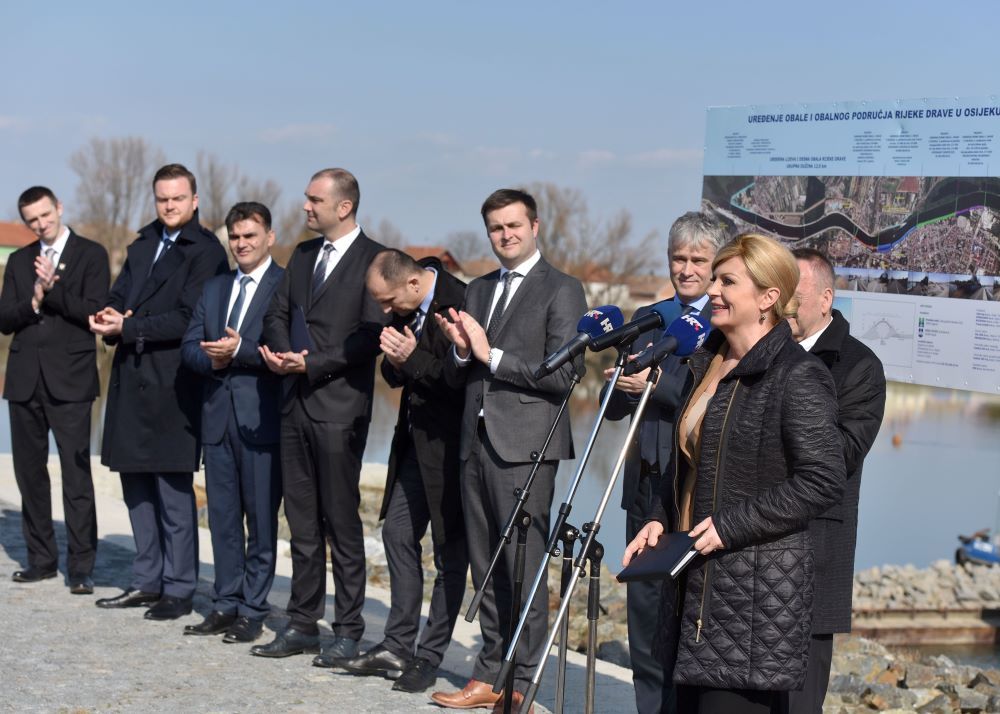 Predsjednica Republike Kolinda Grabar-Kitarović nazočila je u Osijeku početku radova na poddionici "Stara luka Tranzit" u sklopu projekta uređenja desne obale rijeke Drave, te tom prigodom istaknula potrebu ravnomjernog razvoja svih krajeva Hrvatske i decentralizacije zemlje.Ocijenila je kako je riječ o projektu koji će Osječanima život učiniti ljepšim i ugodnijim, omogućiti kontrolu i upravljanje vodama te sprječavati poplave."Nikada ne smijemo razmišljati tko je na vlasti u kojem dijelu Hrvatske, već svi zajedno, neovisno o političkom ili drugom opredjeljenju, moramo raditi u cilju razvojnih programa. Hrvatska je jaka koliko su jaki Osijek ili Rijeka i svi njeni drugi dijelovi. Ne smijemo se koncentrirati niti samo na Zagreb, niti samo velike gradove, jer želimo da se Hrvatska ravnomjerno razvija", poručila je predsjednica Grabar-Kitarović. Podsjetila je i na Inicijativu tri mora, koja je usmjerena na brisanje razlika između slabije i jače razvijenih europskih država, pri čemu su joj posebice važni prometni koridori V b i V c, povezivanje Dunava i Drave s ostalim rijekama te na taj način snaženje luka u Osijeku i Vukovaru.Radovi na poddionici "Stara luka Tranzit" vrijedni su 55,75 milijuna kuna, a ukupna vrijednost projekta je 120 milijuna. Realizacijom cjelokupnog projekta uređenja desne obale Drave Osijek će imati višu razinu zaštite od poplava, a ujedno će se Donji i Gornji grad spojiti pješačko-biciklističkom stazom dugom šest kilometara.