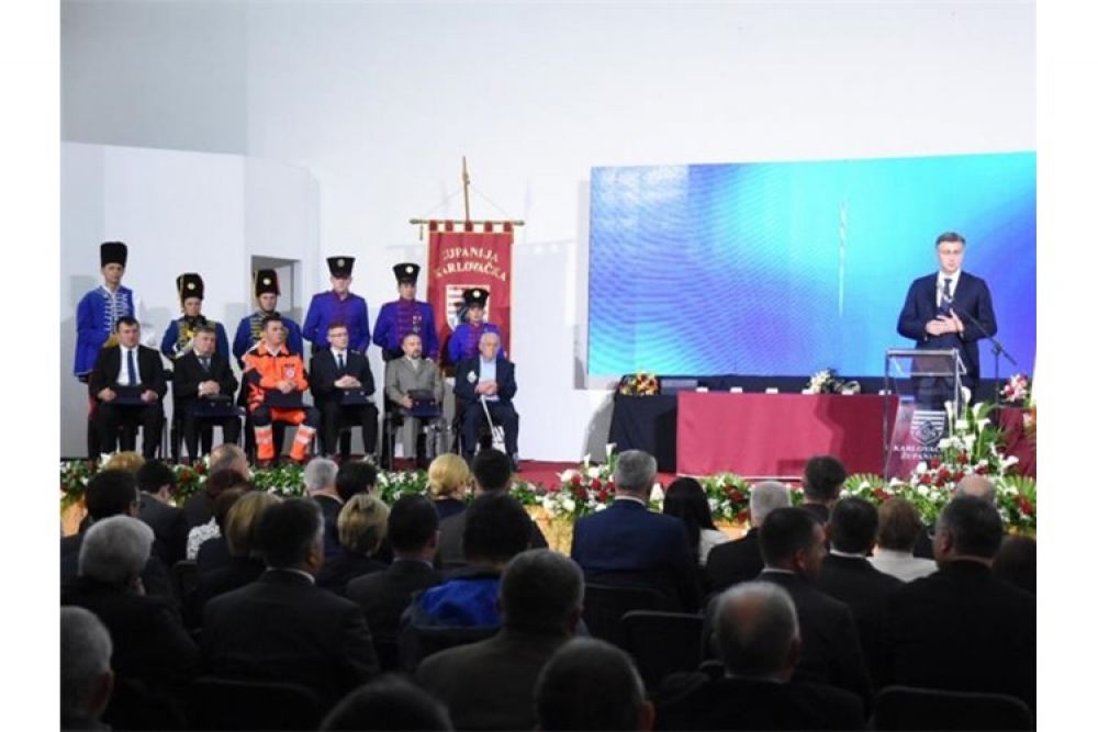 Predsjednik Vlade Andrej Plenković sudjelovao je na svečanoj sjednici Županijske skupštine Karlovačke županije u povodu Dana županije i tom je prigodom zahvalio na svemu što se čini za napredak županije i njezinoga gospodarstva, za demografsku obnovu i kvalitetniji život jedne od najljepših hrvatskih županija.Podsjetivši na sjednicu Vlade održanu prije nekoliko mjeseci u Karlovcu, predsjednik Vlade Plenković kazao je kako je ona bila referentna za budućnost Karlovačke županije i konkretne projekte, a napravila je iskorak u nekim temama koje su dugi niz godina na dnevnom redu te je bila pripremljena u punoj sinergiji i zajedništvu i na temeljitim analizama. „Ukupna vrijednost svih projekata i ugovora koji su se tada potpisali bila je 2 milijarde i 582 milijuna kuna“, dodao je premijer Plenković. Govoreći o projektima u Karlovačkoj županiji, posebno je zadovoljstvo izrazio projektom zaštite od poplava u slivu rijeke Kupe, vrijednim 900 milijuna kuna. Također, dodao je da je Vlada krenula u rješavanja niza nekretninskih pitanja, a Karlovcu i Karlovačkoj županiji do sada je darovala nekretnine u vrijednosti 64 milijuna kuna.
