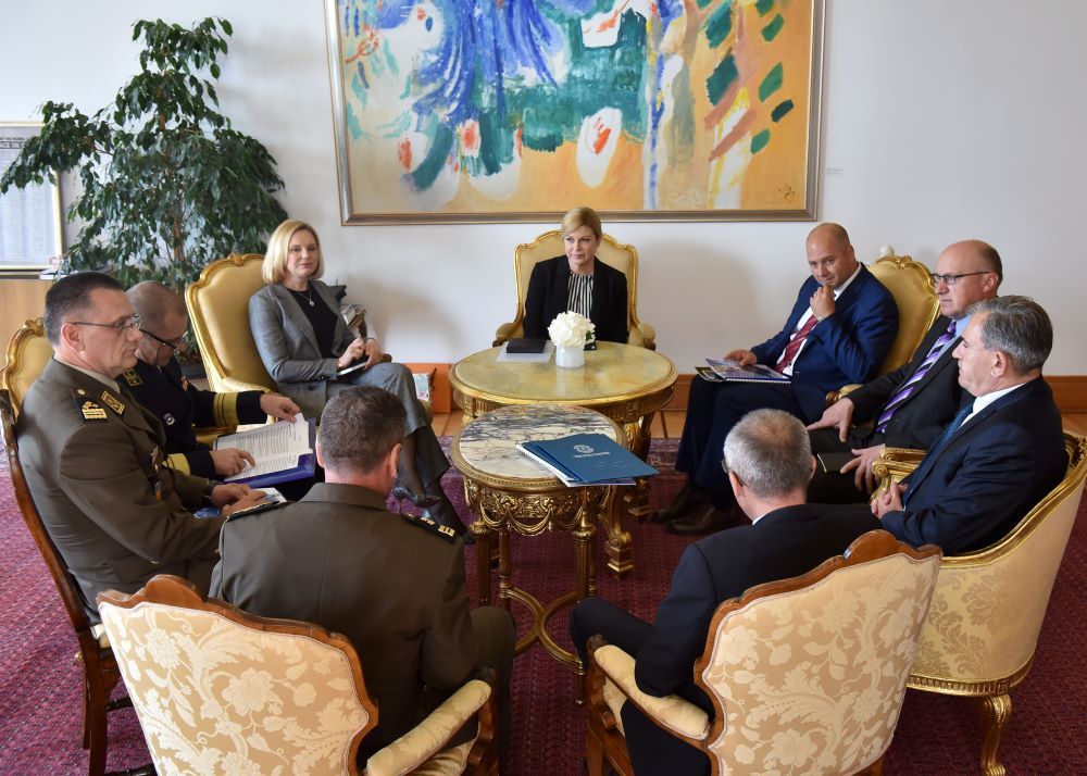 Predsjednica Republike Hrvatske sastala se danas, u povodi predstojećeg Dana Oružanih snaga, Dana Hrvatske kopnene vojske i 28. obljetnice formiranja Hrvatske vojske, s izaslanstvom Ministarstva obrane i Oružanih snaga Republike Hrvatske, predvođenim potpredsjednikom Vlade i ministrom obrane Republike Hrvatske Damirom Krstičevićem, te načelnikom Glavnog stožera OSRH generalom zbora Mirkom Šundovom.Tijekom sastanka razmotreni su ključni projekti i postignuća obrambenog sustava u dosadašnjem tijeku godine te prioritetne zadaće do kraja 2019. Posebno je u tom kontekstu naglašen značaj zadržanog trenda postupnog povećavanja obrambenih izdvajanja, čime su omogućena značajna ulaganja u uvjete života pripadnika Hrvatske vojske, povećanje njihovih materijalnih prava, ubrzana modernizacija i opremanje te intenziviranje njihovog uvježbavanja.