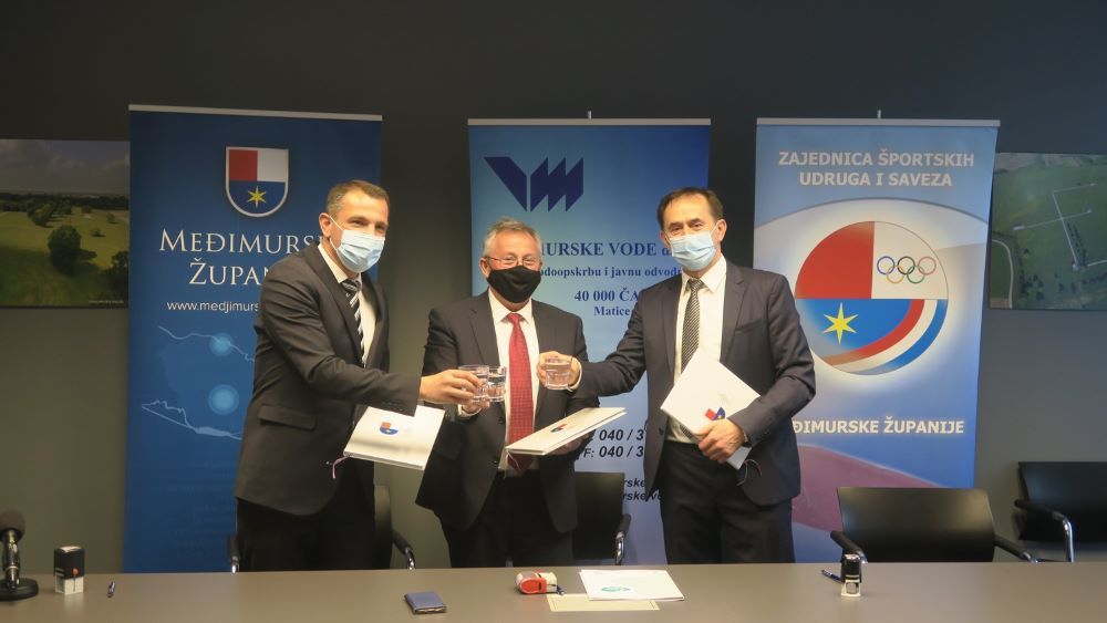 Sporazum o suradnji potpisan je u sjedištu Međimurskih voda koje kroz program društveno odgovornog poslovanja kontinuirano pomažu razvoju sporta u Međimurskoj županiji.Međimurska županija diči se kvalitetom pitke vode koja je vitalna potreba i resurs koji koristimo u svakodnevnom životu te je to samo dodana vrijednost u promociji Međimurja kao destinacije zdravog života. „Naša vizija je biti predvodnik u pružanju usluga vodoopskrbe u Hrvatskoj. Uspješni smo u povlačenju europskih sredstva za pripremu i gradnju vodo-komunalne infrastrukture u Hrvatskoj što nas još više povezuje s Međimurskom županijom koja je među najuspješnijim hrvatskim županijama u korištenju EU fondova.“, istaknuo je direktor tvrtke Međimurske vode d.o.o Vladimir Topolnjak, prilikom potpisivanja sporazuma sa županom Međimurske županije Matijom Posavcem i predsjednikom Zajednice sportskih udruga i saveza Međimurske županije Matom Kljajićem.