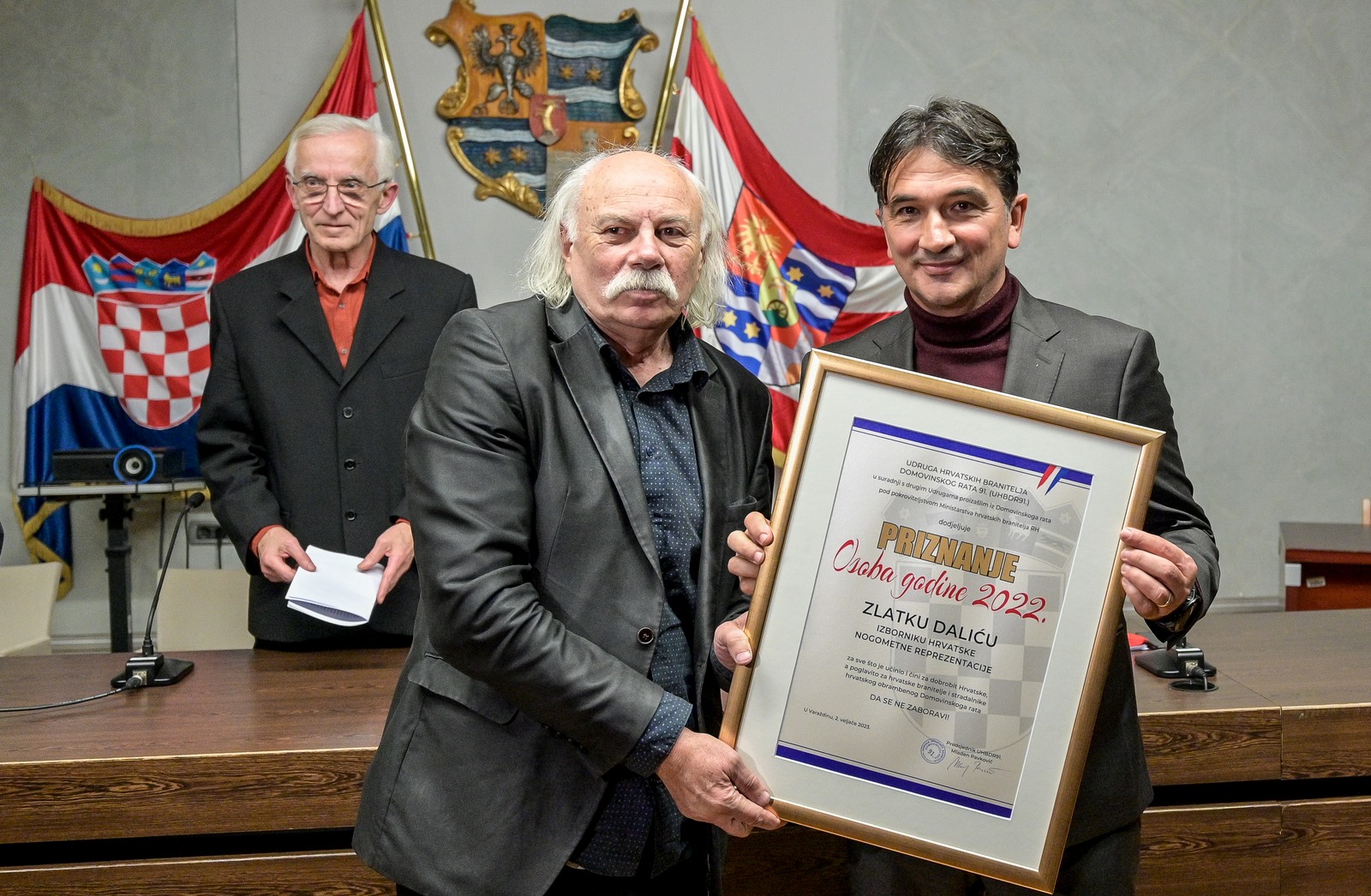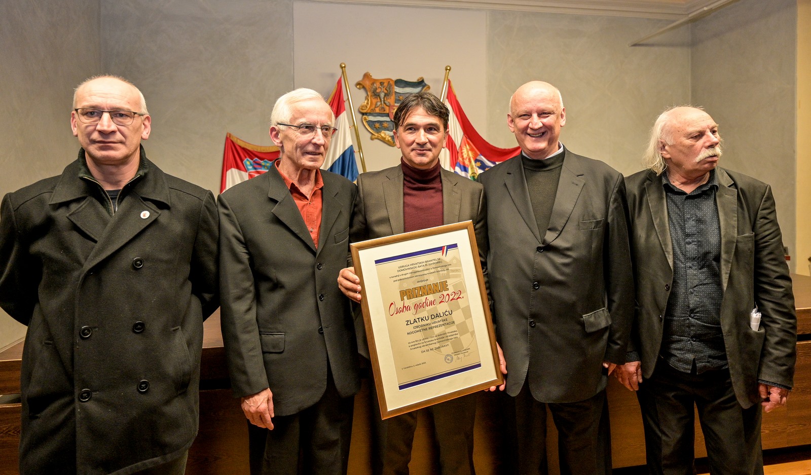 Zlatku Daliću izborniku Hrvatske nogometne reprezentacije u četvrtak, 2. veljače u prepunoj dvorani varaždinske županijske palače pod pokroviteljstvom Ministarstva hrvatskih branitelja, svečano je uručeno priznanje „Osoba godina 2022“ koju su mu dodijelili hrvatski branitelji. Bila je to još jedna prelijepa večer puna optimizma na kojoj su branitelji, kojima je Dalić i posvetio nastupe Hrvatske reprezentacije na Svjetskom prvenstvu u Kataru radosno skandirali svom idolu i izborniku svih izbornika, kako je Dalića u svom obraćanju nazvao general Ivan Tolj. Svečana dodjela ličila je na kulturno-umjetničku priredbu u kojoj su uživali svi nazočni, pa su u tom nevjerojatno ugodnom raspoloženju mnogi i zapjevali.