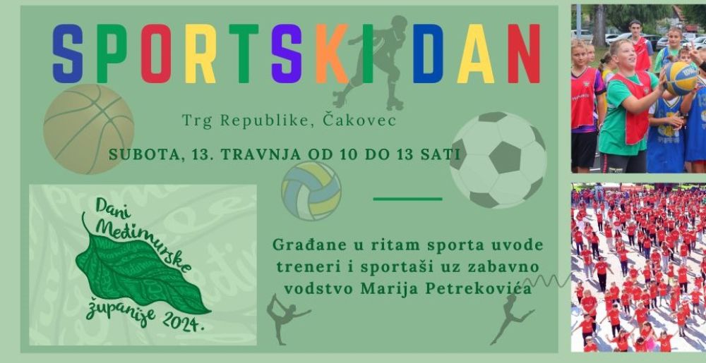 U subotu, 13. travnja, od 10 do 13 sati, Trg Republike u Čakovcu odzvanjat će ritmom zdravlja i sporta u Sportskom danu za sve građane, povodom Dana Međimurske županije.