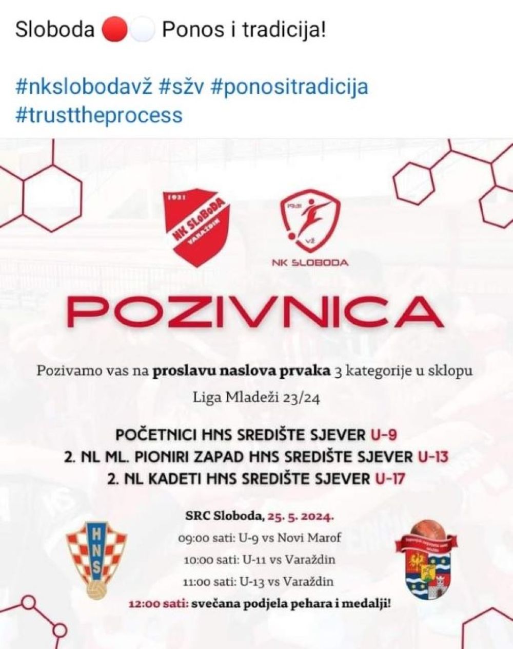Mladi varaždinski nogometaši – dječaci uzrasta 9, 11 i 13 godina u subotu 25. svibnja ujutro i prijepodne na nogometnom stadionu Sloboda igraju završne utakmice svojih natjecateljskih liga. Tako je susret uzrasta U-9 između NK Sloboda i NK Novi Marof na rasporedu u 9 sati, susret uzrasta U-11 NK Sloboda – NK Varaždin u 10 sati, dok će posljednji susret u 11 sati na Slobodi igrati ekipe uzrasta U-13 NK Slobode i NK Varaždina. Nakon utakmica u podne će medalje i pehare najboljim igračima, kapetanima ekipa, te strijelcima i golmanima dodijeliti predstavnici Grada Varaždina i Županijskog nogometnog saveza. Kako su najavili organizatori, na svečanoj dodjeli očekuje se i dolazak hrvatskog nogometnog izbornika Zlatka Dalića koji će uoči predstojećega Europskoga nogometnog prvenstva svojim prisustvom dati podršku školi nogometa i varaždinskim mladim nogometašima.