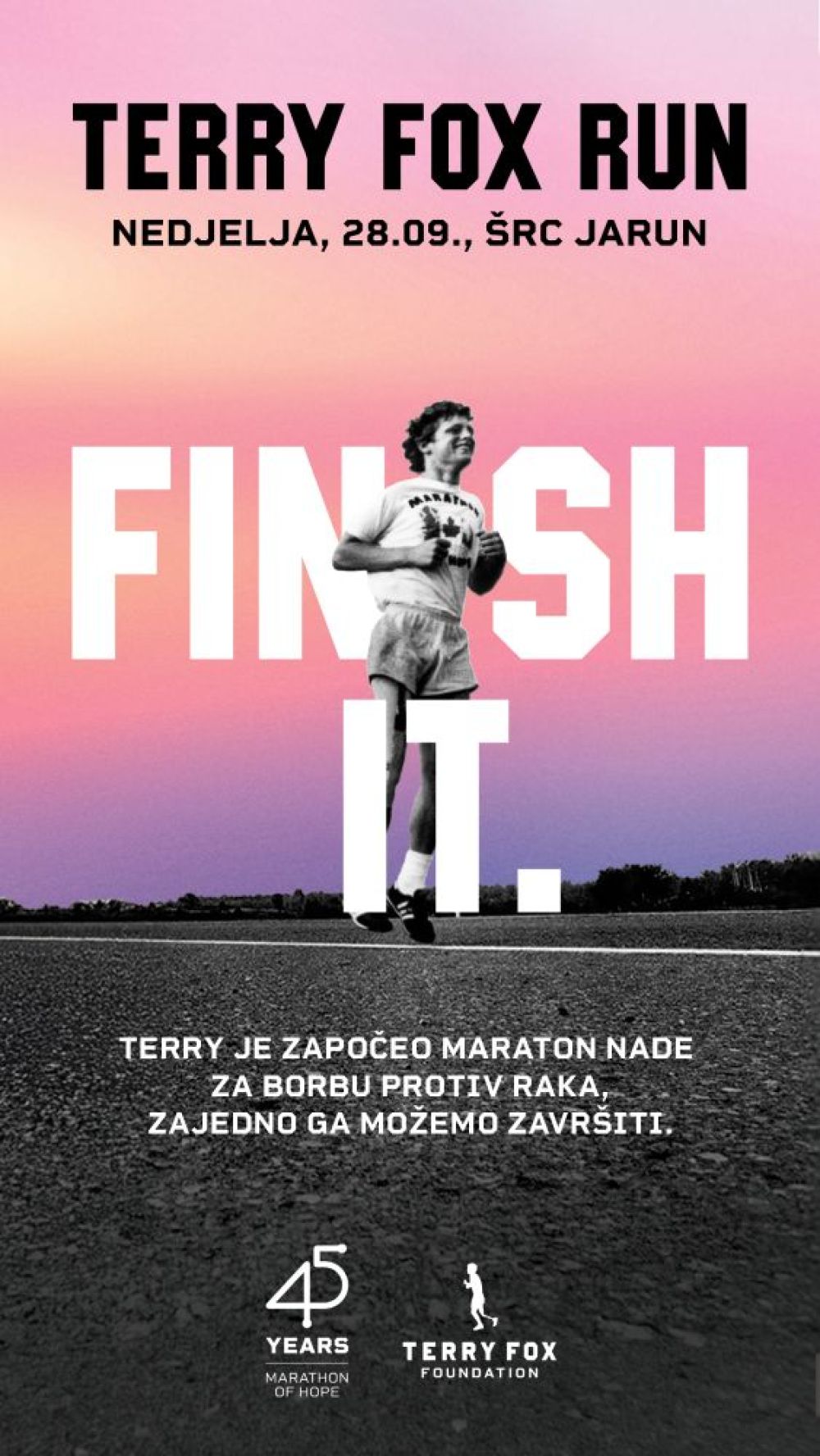 Terryjev cilj nije bio samo istrčati Maraton nade, već probuditi svijest i pokrenuti ljude diljem svijeta da pomognu pronaći lijek za rak. Danas, desetljećima nakon njegovog prvog koraka, poruka odjekuje još snažnije, vrijeme je da zajedno ostvarimo taj cilj. Trka će se održat u nedjelju, 28. rujna na Jarunu, na košarkaškom terenu uz malo jezero. Humanitarna akcija započinje tradicionalnom prodajom majica u subotu, 27. rujna, u Centru Cvjetni, kao i u City Center one East i West shopping centrima od 10 do 14 sati. Majice će se prodavati za donaciju u minimalnom iznosu od 15 eura, a bit će ih moguće kupovati sve do isteka zaliha, narudžbom putem Facebook stranice www.facebook.com/TFRCroatia kao i na sam dan trke.