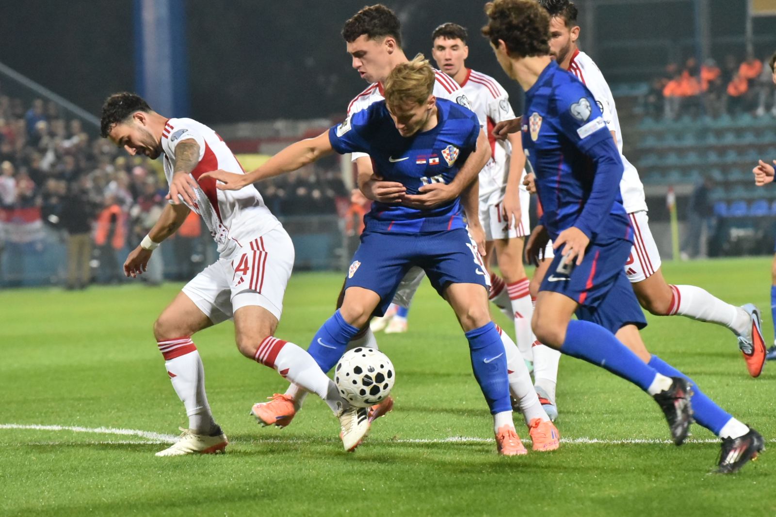 Nogometna reprezentacija Hrvatske svladala je u Varaždinu Gibraltar s uvjerljivih 3:0 (1:0) u kvalifikacijskoj skupini L za odlazak na Svjetsko prvenstvo 2026. godine. Ovom pobjedom izabranici Zlatka Dalića stigli su na korak do potvrde novog plasmana na veliku scenu. Prvi pogodak na utakmici i u reprezentativnoj karijeri postigao je Toni Fruk u 30. minuti, kada je glavom iskoristio ubačaj Marca Pašalića. Minimalnih 1:0 stajalo je na semaforu sve do završnice susreta, kada su svoje premijerne pogotke u hrvatskom dresu upisali i Luka Sučić (78’) te Martin Erlić (96’). Foto: AFP/ Gol.hr