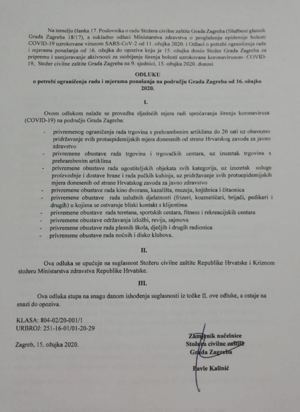 U dokumentu odluke o potrebi ograničenja rada i mjerama ponašanja, koji bi važio od 16. ožujka do opoziva, stožer osnovan pri Gradskom uredu za zdravstvo predlaže zagrebačkom Gradskom stožeru i Nacionalnom stožeru civilne zaštite ograničenje rada trgovačkih centara i trgovina manje veličine na području Zagreba uz obavezno pridržavanje svih protuepidemijskih mjera koje je donio Hrvatski zavod za javno zdravstvo.