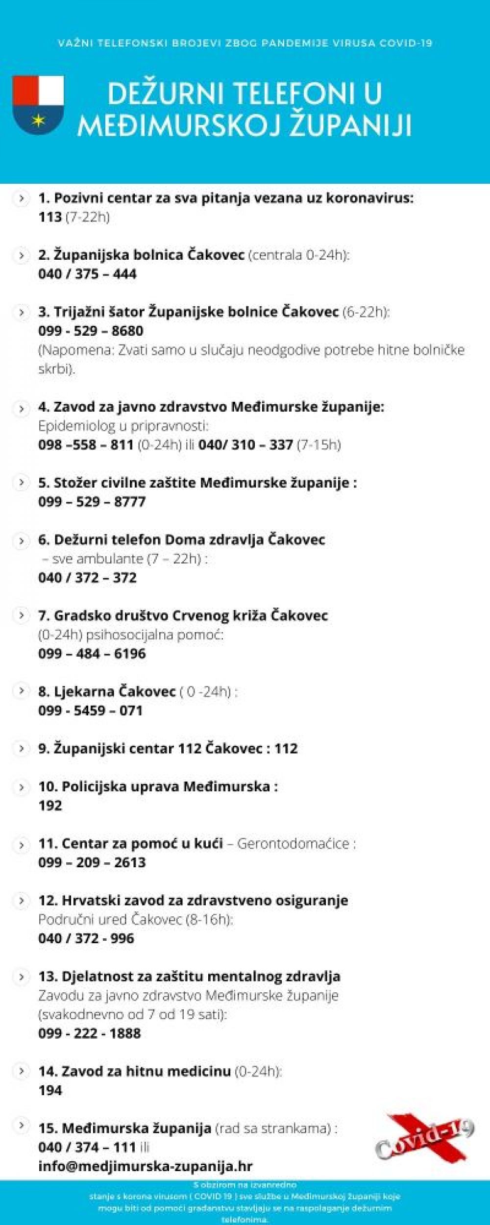 Onima koji nemaju takve osobe koji će s njima podijeliti njihove strepnje, ili koji osjećaju značajnije tegobe iz područja svog mentalnog zdravlja, nudimo mogućnost razgovora s našim stručnjacima iz Djelatnosti za zaštitu mentalnog zdravlja, prevenciju i izvanbolničko liječenje ovisnosti putem telefona 099 222 1 888, svakodnevno od 7 – 19 sati.