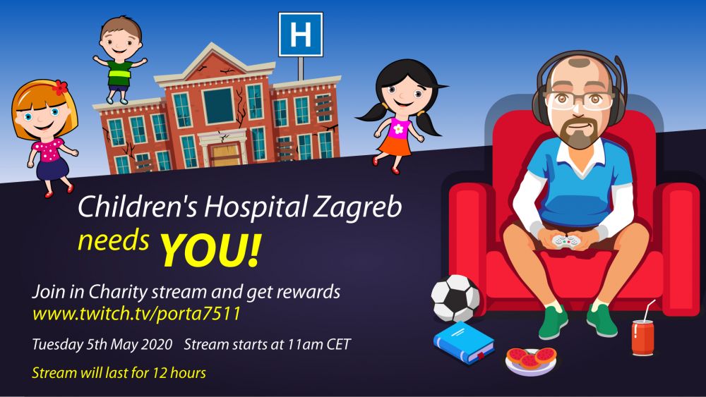 Dječja bolnica Klaićeva sada treba TEBE! Humanitarni Twitch stream za obnovu zgrade kirurgije Klaićeve bolnice. odvijat će se na Twitch platformi 05.05.2020. s početkom u 11h i s trajanjem do 23h. Kanal streama: www.twitch.tv/porta7511 Kao što svi znamo 22.03.2020. godine snažan potres je pogodio Zagreb. Veliki dio grada je oštećen, a među njim je i Klinika za dječje bolesti Zagreb (Klaićeva). Nažalost, zgrada "Fisher" u kojoj su smješteni odjeli dječje kirurgije je evakuirana i zatvorena. Upravo zbog toga je streamer Hrvoje Horvat (Porta7511) pokrenuo ovu hvalevrijednu akciju zajedno s ravnateljem prof. Roićem te su odlučili organizirati humanitarni stream. S obzirom na situaciji Covid-19 koji nas sprečava u kretanju i okupljanju organizatori su odlučili napraviti humanitaran stream na Twitch platformi, koja se u ovim okolnostima pokazuje kao najbolje rješenje. Kako bi mogli prisustvovati humanitarnom streamu ne trebate izlaziti iz kuće. Sve što je potrebno imati kako bi pristupili stremu i sudjelovali u akciji su računalo ili mobitel te Internet veza. Prikupljena sredstva namijenjena su za obnovu oštećene zgrade Klinike za Dječje bolesti Zagreb koja je prva hrvatska ustanova koja je izlistana na Softgiving servisu koji omogućuje lagano doniranje širom svijeta.
