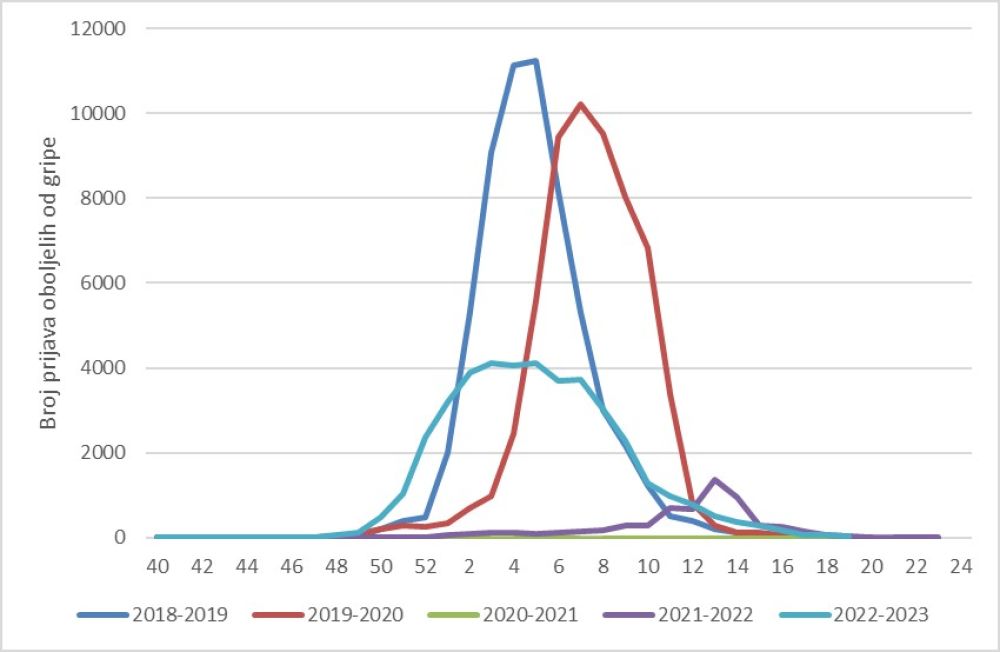 Riječ je, dakako, o godinama kada je harala pandemija Covid – 19. Mjere poduzete za zaštitu od Covid – 19 su spriječile širenje gripe pošto se obje bolesti prenose na sličan način. Izvori informacija: Hrvatski zavod za javno zdravstvo, www.hzjz.hr i National library of medicine, https://www.ncbi.nlm.nih.gov/