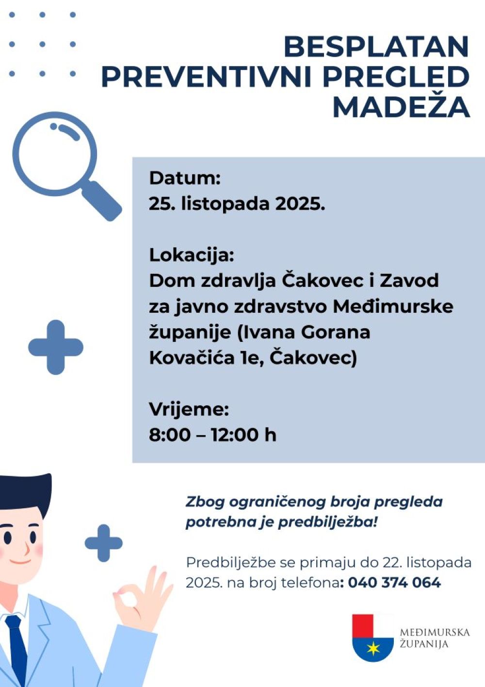 Međimurska županija, u suradnji s Domom zdravlja Čakovec, županijskim Zavodom za javno zdravstvo te specijalistima dermatovenerologije iz Međimurja, organizira projekt posvećen zdravlju građana. Riječ je o besplatnom pregledu madeža s ciljem educiranja ljudi, te pravovremenog otkrivanja zloćudnih promjena. Projekt će se provesti u subotu, 25. listopada u prostorima Doma zdravlja te Zavoda za javno zdravstvo Međimurske županije, od 8 do 12 sati. No, građani se trebaju predbilježiti kako bi dobili svoj termin za pregled, čime će se spriječiti gužve te omogućiti liječnicama da stignu pregledati zainteresirane građane. Predbilježbe se primaju do srijede, 22. listopada putem broja telefona 040 374 064.