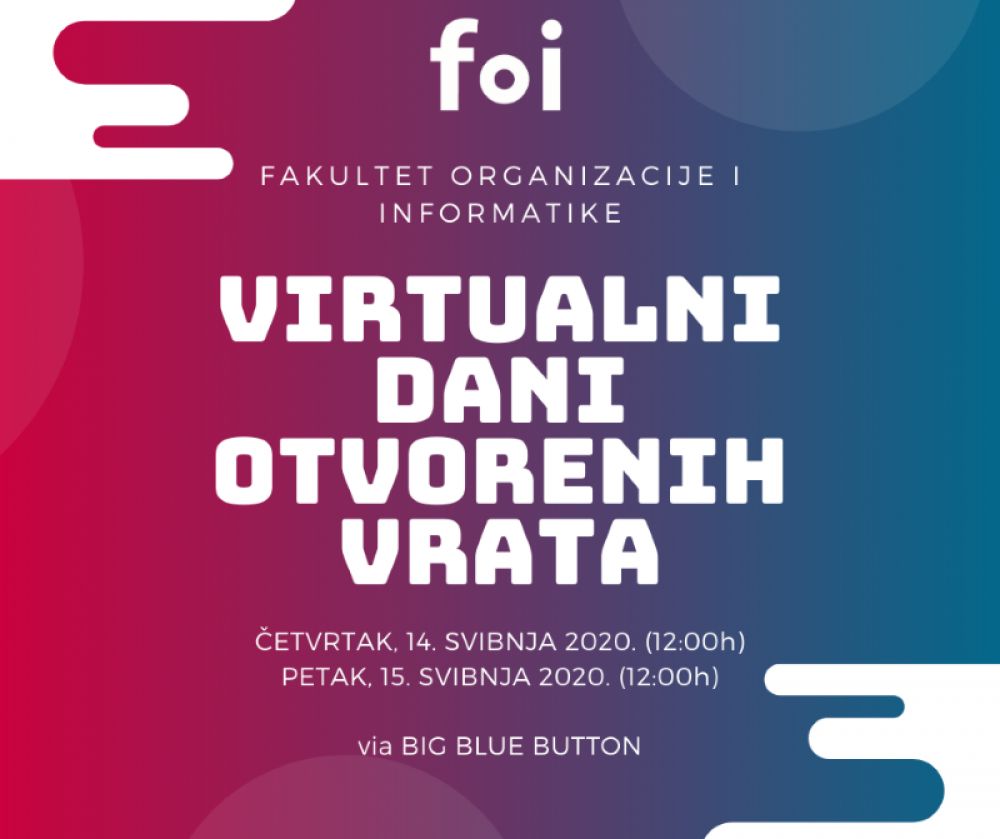 Fakultet organizacije i informatike Sveučilišta u Zagrebu organizira svoje prve Virtualne dane otvorenih vrata, koji će se održati putem konferencijskog sustava Big Blue Button, u dva termina: u četvrtak, 14. svibnja i u petak, 15. svibnja s početkom u 12 sati. Cilj Virtualnih dana otvorenih vrata jest pokazati učenicima i budućim studentima kako izgleda proces studiranja na FOI-ju te ih pobliže upoznati s vrlo traženim studijskim programima te svim novinama koje FOI planira uvesti s novom akademskom godinom 2020./2021.