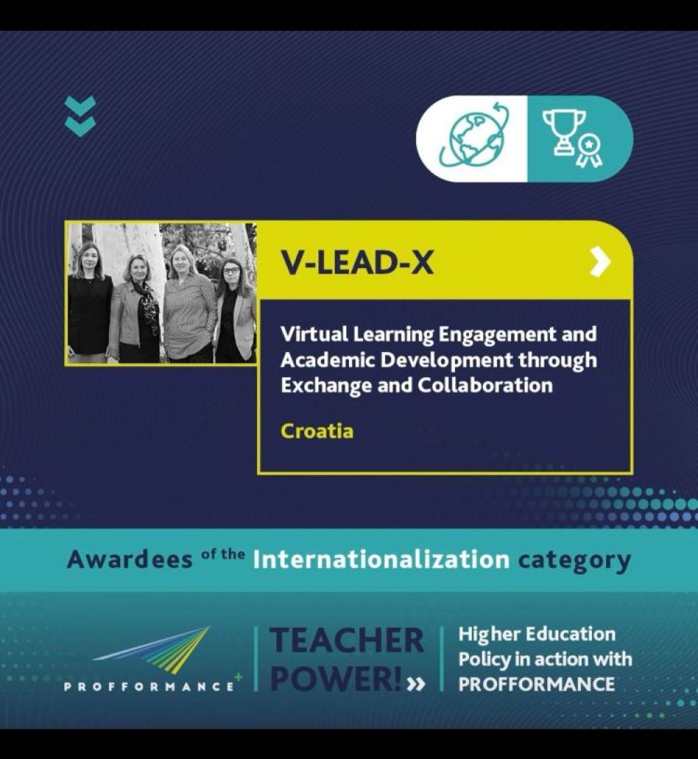 Njihov projekt V-LEAD-X Virtual Learning Engagement and Academic Development through Exchange and Collaboration osvojio je drugo mjesto u kategoriji internacionalizacije nastave. Projekt V-LEAD-X jedan je 286 primjera nastavne prakse u javno dostupnoj bazi nastavne izvrsnosti platforme Profformance.