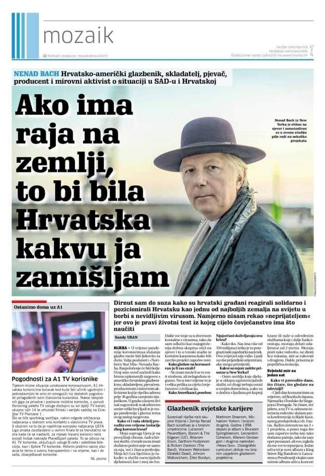 Hrvatsko američki glazbenik Nenad Bach poslao je danas na mnogobrojne adrese svojih prijatelja diljem svijeta newsletter nad kojim se trebamo zamisliti. Je li ovdje riječ o nečem što mogu spoznati samo iznimno senzitivne osobe - mogućnosti za prestanak međusobnog ratovanja – te njemu kao suvremenom proroku, ali proroku onoga što je najvažnije za opstanak cijelog čovječanstva – realne mogućnosti za uspostavljanje svjetskog mira?