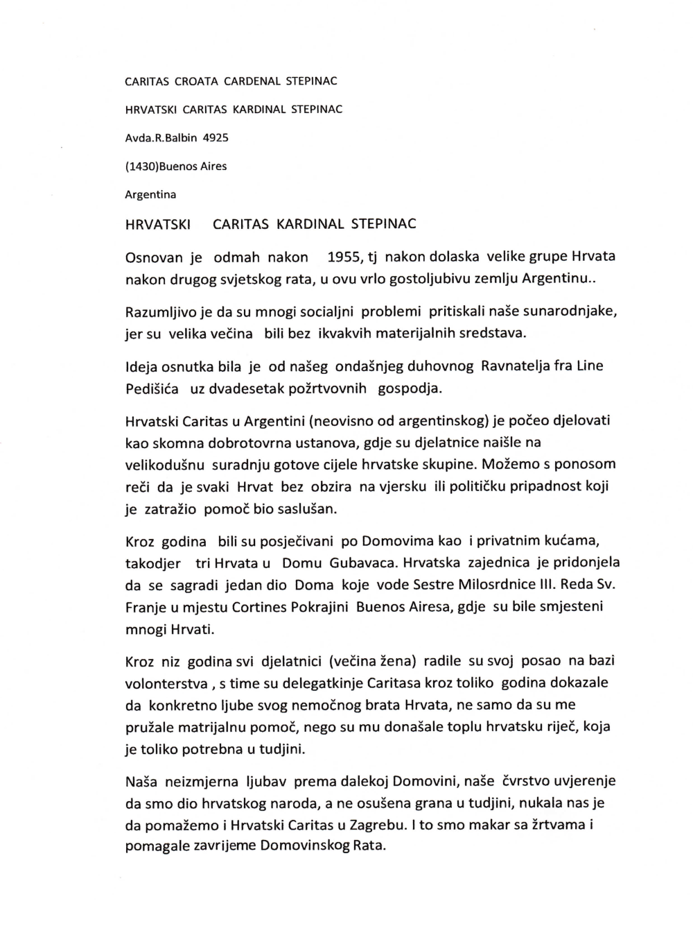 - Tek godine 1986 prišla sam Hrvatskom Caritasu "Kardinal Stepinac", kao aktivna članica i danas sam predsjednica. O aktivnosti i općenito djelovanju Caritasa prilažem jedan moj osvrt na rad i povijest. Stalno sudjelujem u hrvatskoj zajednici i bila sam imenovana kao predstavnica Međudruštvenog odbora Hrvatskih ustanova u Argentini i član Savjeta Hrvata izvan RH, na skupu u Zagrebu godine 2014. Te veze s hrvatskom domovinom iznimno su nam važne.