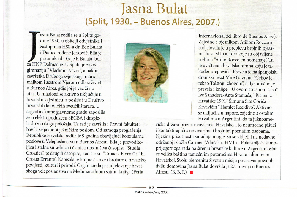 Vjera Bulat Petrošić putem Hrvatskog Caritasa dokazala je bezbroj puta koliko je jaka ljubav argentinskih Hrvata spram daleke im domovine, pomažući joj u vremenima nevolje, a osobito u vrijeme Domovinskoga rata. Rođena je u Splitu 1934. godine. Otac joj je bio dr. Edo Bulat, rođen također u Splitu, a majka Danica Jerković, rođena je u Starigradu, na otoku Hvaru. U Argentinu je s majkom i sestrom stigla 1948. godine. Tada se odlazilo iz ekonomskih, ali i političkih razloga, onih zbog kojih se dogodio i Bleiburg. Da ne bi bili proglašeni "narodnim neprijateljima" bježala je i inteligencija. O životu u Argentini i njezinom životnom putu i karijeri i ljubavi prema Hrvatskoj razgovarale smo na daljinu.