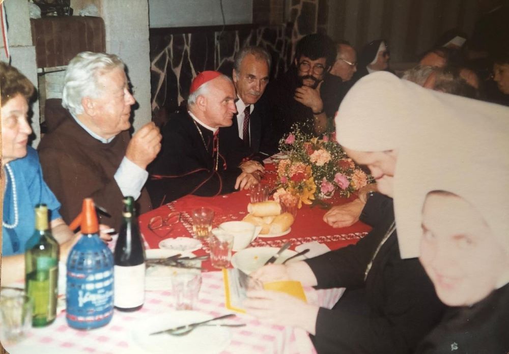 foto;Godina 1986. Posjet Kardinala Kuharića: Padre Lino Pedišić, Mada Hubmayer, Arsen Petrošić, Vjersko središte Sv. Nikola Tavelić - Buenos Aires