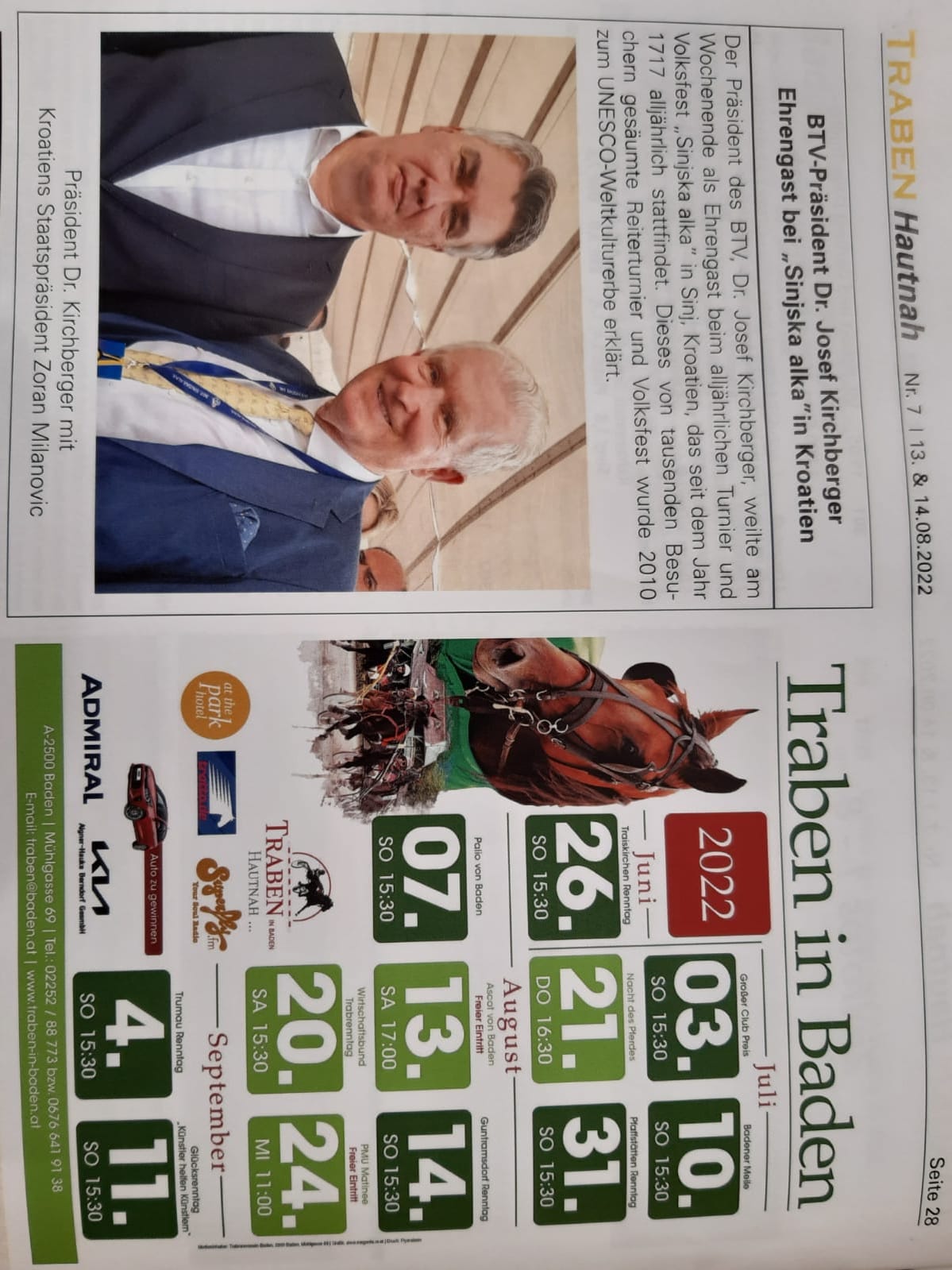 Delegacija Viteškog alkarskog društva je došla pogledati kasačko trkalište u Baden, bio je svibanj 2022. Bio sam kao gost pozvan na Sinjsku alku 2022. i sa mnom je došao gosp. predsjednik kasačke udruge Baden/BTV gosp. Dr. Josef Kirchberger, fotografiju njega s Milanovićem vidite u prilogu.