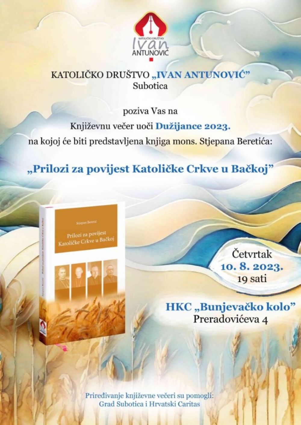 Katoličko društvo „Ivan Antunović” iz Subotice obilježava u četvrtak 10. kolovoza Dan Društva i priređuje književnu večer uoči Dužijance 2023. na kojoj će biti predstavljena nova knjiga mons. Stjepana Beretića „Prilozi za povijest Katoličke Crkve u Bačkoj“. U okviru večeri bit će dodijeljene i nagrade „Ivan Antunović“ jednom istaknutom pojedincu, udruzi i obitelji. Program počinje u 19 sati u svečanoj dvorani HKC „Bunjevačko kolo“ u Subotici.