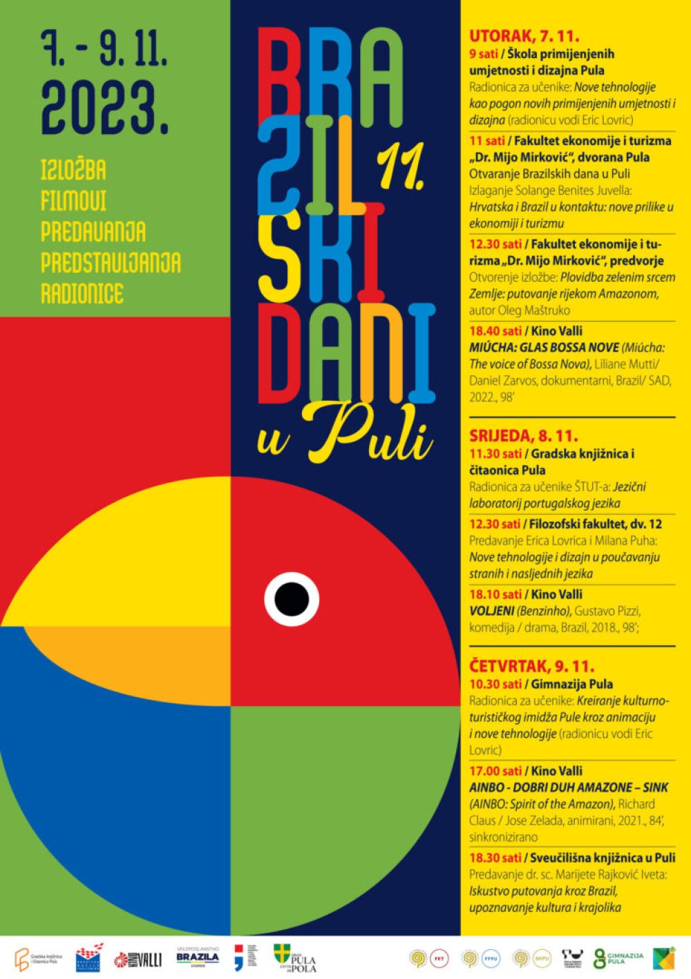 U četvrtak, 9. studenoga, ujedno i posljednjeg dana manifestacije održat će se radionica koju će voditi naš gost Eric Lovrić. Na radionici Kreiranje kulturno-turističkog imidža Pule kroz animaciju i nove tehnologije u dijalogu s pulskim gimnazijalcima kreirat će zajednički prijedlog kulturno-turističkog imidža Pule. U popodnevnim satima u Kinu Valli slijedi projekcija sinkroniziranog animiranog filma Ainbo – Dobri duh Amazonije u kojemu mogu uživati i najmlađi. Ovogodišnje Brazilske dane u Puli zaključit će predavanje o Iskustvu putovanja kroz Brazil, upoznavanje kultura i krajolika dr. sc. Marijete Rajković Iveta, etnologinje, kulturne antropologinje i izvanredne profesorice Filozofskoga fakulteta Zagrebu koje će se održati u Sveučilišnoj knjižnici u Puli.