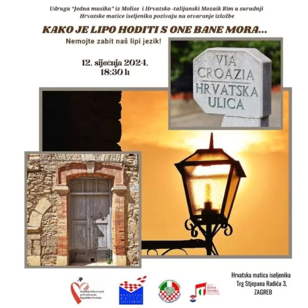 Udruga Hrvatsko-talijanski Mozaik Rim i „Jedna musika“ iz Molisea u suradnji s Hrvatskom maticom iseljenika pozivaju vas 12. siječnja 2024. u 18 sati na otvaranje izložbe KAKO JE LIPO HODITI S ONE BANE MORA... i projekciju dokumentarnog filma docuMAJA