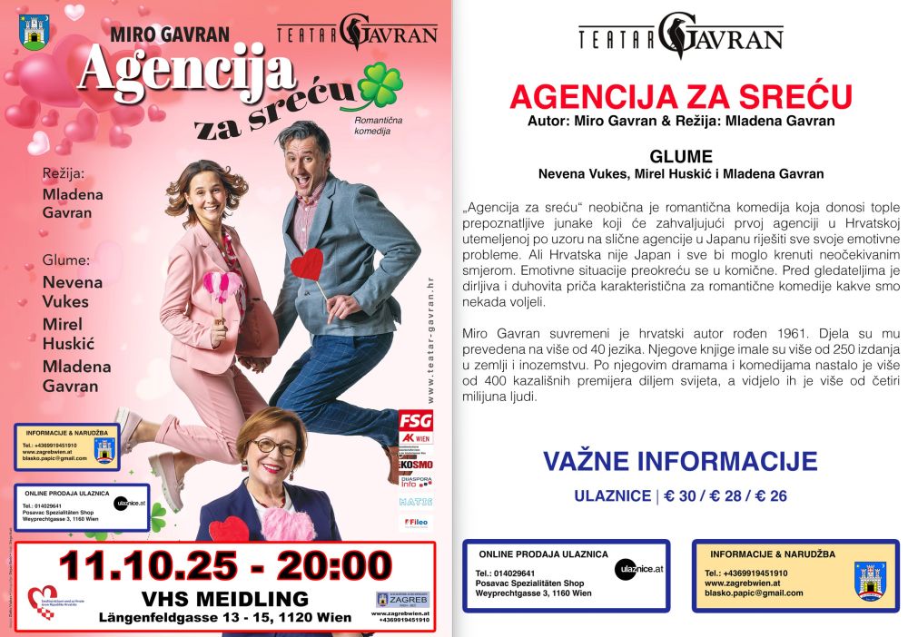 U Beču u WHS Meidling 11. listopada gostuje Gavran Teatar s predstavom Agencija za sreću“ .Riječ je romantičnoj komediji koja donosi tople prepoznatljive junake.