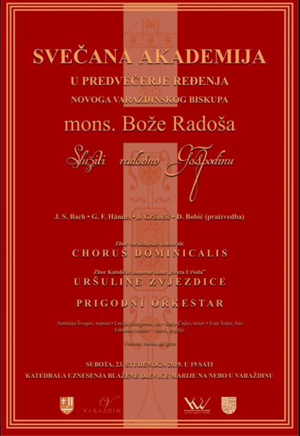 Svečana akademija u molitveno-meditativnom ozračju održat će se u varaždinskoj katedrali s početkom u 18 sati, u predvečerje ređenja novog varaždinskog biskupa mons. Bože Radoša, u subotu 23. studenoga, nakon svete mise.U glazbenom dijelu akademije bit će održan koncert pod nazivom “Služiti radosno Gospodinu”, što je ujedno i biskupsko geslo novog varaždinskog biskupa. Bit će izvedena djela Johanna Sebastiana Bacha, Georga Friedricha Händela, Jerka Gržinčića i Davora Bobića.