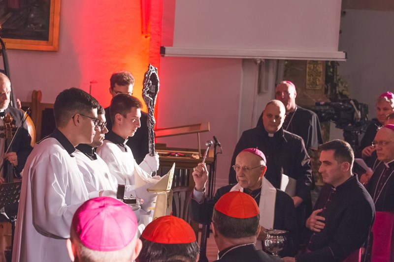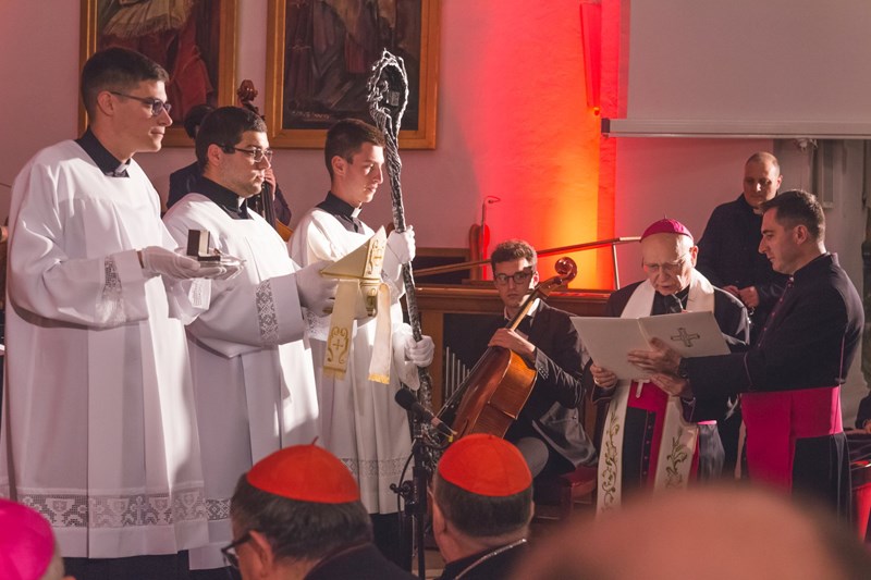 Na kraju programa mons. Marin Srakić, đakovačko-osječki nadbiskup u miru, blagoslovio je biskupske insignije novoga varaždinskog biskupa: štap, mitru i prsten.