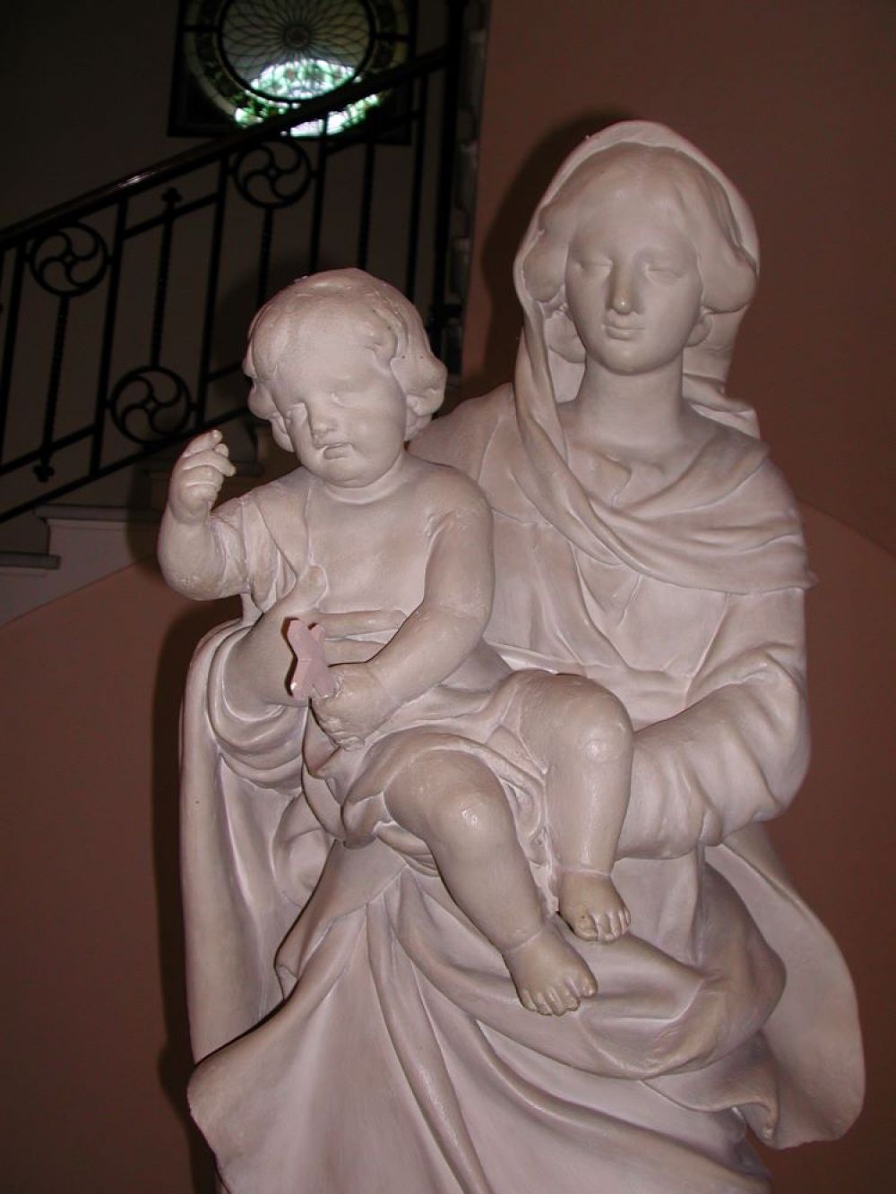 Kip Majke Utjehe odiše nježnošću. Drži Isusa kao da ga želi nama predati. On pak sam kao da želi izletjeti iz Marijina naručja da nam se što više približi. Desnom rukom pokazuje dvostruku gestu: blagoslov i poziv: „Dođite k meni svi umorni i opterećeni i ja ću vas odmoriti. A u lijevoj drži križ u „kojem je spas, život i uskrsnuće naše“.