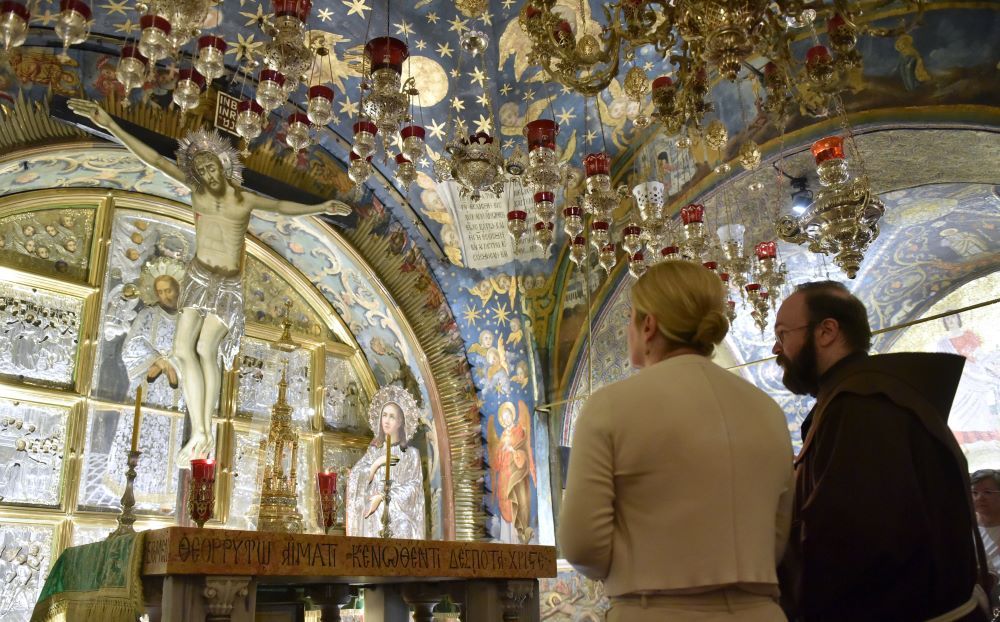Obraćajući se kustosu fra Francescu, gvardijanu samostana fra Marcelu i definitoru Kustodije Svete zemlje fra Siniši, predsjednica Grabar-Kitarović izrazila je zadovoljstvo susretom, istaknuvši ponos na sve hrvatske franjevce koji su kroz sedam stoljeća zajedno sa svojom braćom iz cijele Europe čuvali Kristov grob i brinuli se o kršćanima u Svetoj zemlji. Dodala je kako je, uz svetog Tavelića i blaženog Stepinca, dugačak popis hrvatskih franjevaca koji su ostvarili svoju duhovnu i humanitarnu misiju u Svetoj zemlji. „Mnogi su se istaknuli svetačkim životom i mučeništvom, pomažući bolesne i potrebite. Mnogi su radili kao znanstvenici i spisatelji povijesnih i religijskih publikacija, a spomenuti Dubrovčanin Fra Drkolica obnovio je baziliku Kristova groba. Spomenut ću još i dva brata, hrvatska trgovca iz Bosne koji su otkupili Getsemanski vrt i dali ga na upravu Franjevcima“.