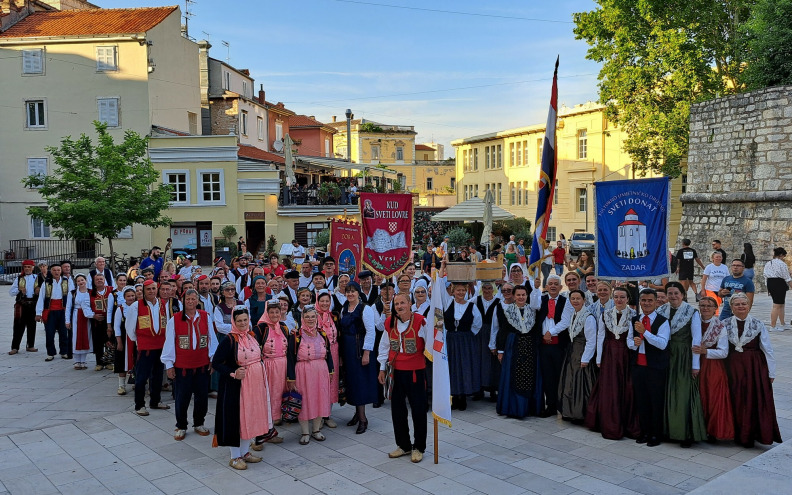 Na susretu pak u Zadru sudjelovali su KUD »Sveti Lovre« iz Vrsi, KUD »Zora« iz Betine otok Murter, Udruga za očuvanje baštine Cetinskog kraja iz Sinja, FA »Nova Nada« iz Detroita, KUD »Podbablje« iz Podbablja i domaćin KUD »Sveti Donat« iz Zadra. Defile sudionika krenuo je od crkve Gospe od Zdravlja, pored Sv. Stošije, duž cijele Kalelarge sve do trga Petra Zoranića gdje se odvijao službeni program. Voditelj je bio Mihovil Mijo Brkić poznati novinar radio Benkovca koji je u svojoj uvodnoj riječi pozdravio sve prisutne i pozvao Mirjanu Pešu predsjednicu KUD-a »Sveti Donat« koja je pozdravila prisutne te im se zahvalila što su došli u tako velikom broju.  (Tekst i fotografije: Zadarski list / Vesna Benić)