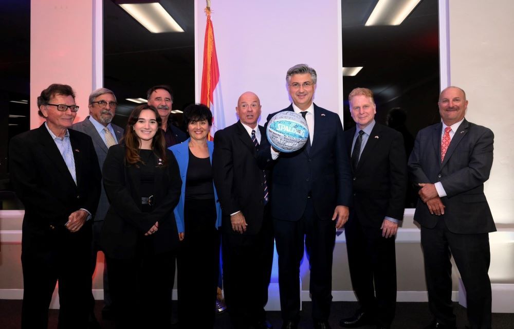 s hrvatskim grbom, kristalna zdjela i košarkaška lopta s potpisima svih nazočnih uzvanika, s obzirom na premijerovu strast prema košarci.