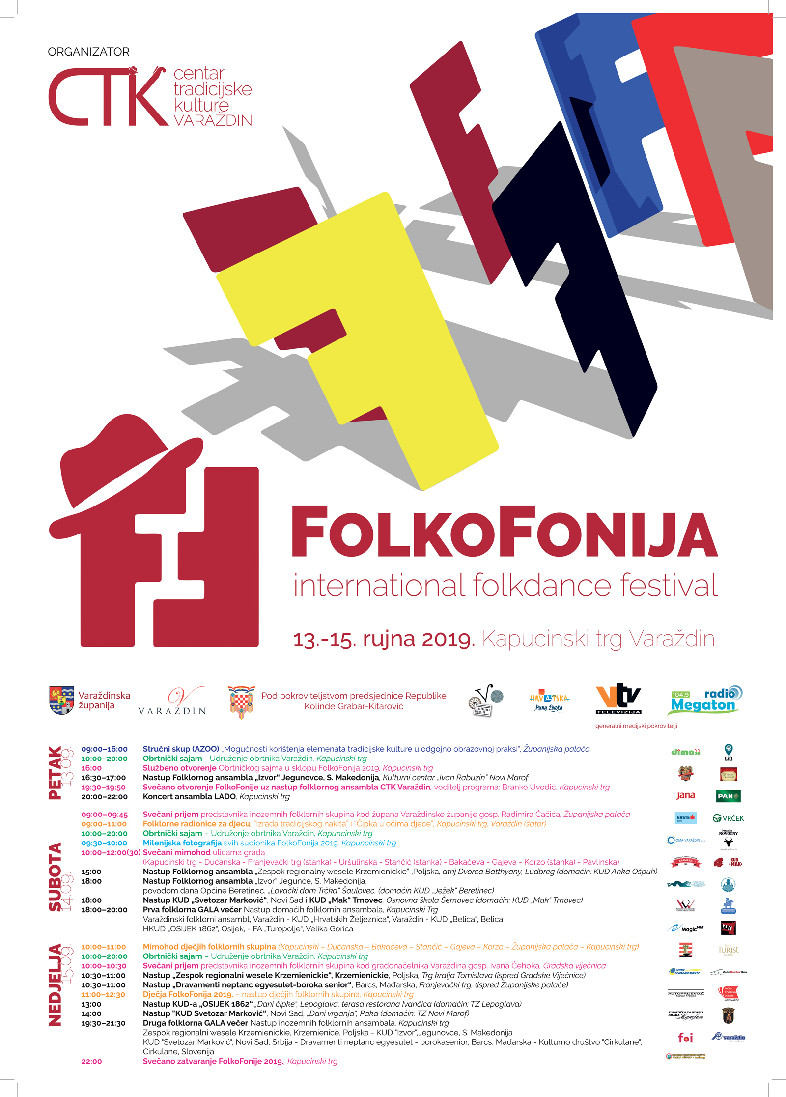 Danas, 13. rujna, započinje FolkoFonija - 5. Međunarodni festival tradicijske kulture. Festival traje od 13.-15. rujna, a održava se u sklopu obilježavanja Dana Županije. Prigodni program danas započinje svečanim otvorenjem na Kapucinskom trgu u 19.30 sati, a u 20.00 sati očekuje nas veliki plesni spektakl – premijerni koncert Ansambl LADO. U 16. sati otvara se i Obrtnički vozila.