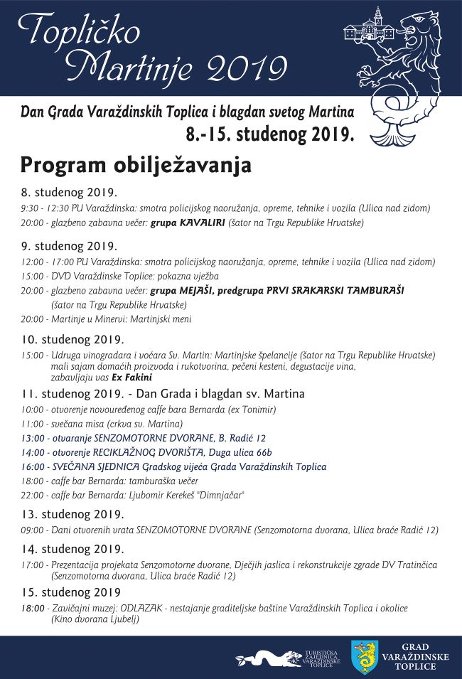 U Varaždinskim Toplicama pripremili su bogati program povodom obilježavanja Dana Grada i blagdana svetog Martina, koji će se održavati od 8. do 15. studenog. Od ove godine Dan Grada Varaždinskih Toplica ponovno se obilježava oko blagdana svetog Martina, zaštitnika topličke župe. Osmišljavanjem programa manifestacije „Topličko Martinje 2019“, Varaždinske Toplice su uz Aquafest i Lovrečevo festival, dobile još jedno atraktivno događanje kojim se dodatno obogaćuje turistička, kulturna, zabavna i glazbena ponuda Toplica.