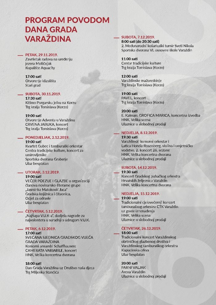 Obilježavanje Dana grada Varaždina i blagdana svetog Nikole 6. prosinca već otpočelo s događanjima kojima je počelo i vrijeme Došašća. Veliki adventski sajam počeo je otvaranjem Ledene čarolije na Starom gradu, uz kićenje jelke na Korzu te koncert popularne Crvene jabuke, Na sam blagdan Svetog Nikole, pak,u petak 6. prosinca, u HNK Varaždin održati će se svečana sjednica Gradskog vijeća, a u većernjim satima u Velikoj koncertnoj dvorani i koncert Komornog ansambla Schafhausen: Camerata variabile,
