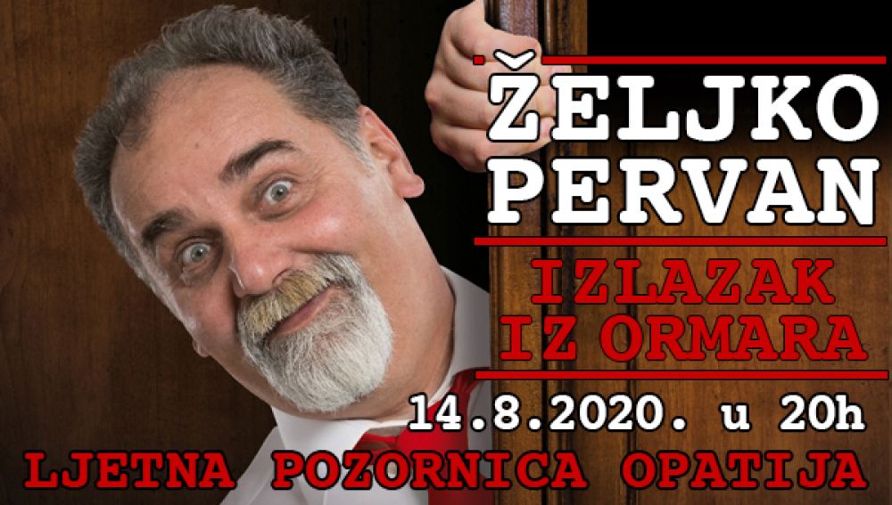 Omiljeni hrvatski komičar Željko Pervan ovoga ljeta sa svojim hit showom „Izlazak iz ormara“ 14. kolovoza stiže na Ljetnu pozornicu u Opatiju!„Izlazim iz ormara. Iz kuće. Iz grada. Stižem u Opatiju i ne tajim ništa. Sve što nekada nije bio red reći, došlo je na red. Samo se smijte, meni je svejedno!“ najavljuje Željko Pervan svoj novi show, u kojem ponovno možete očekivati – neočekivano!