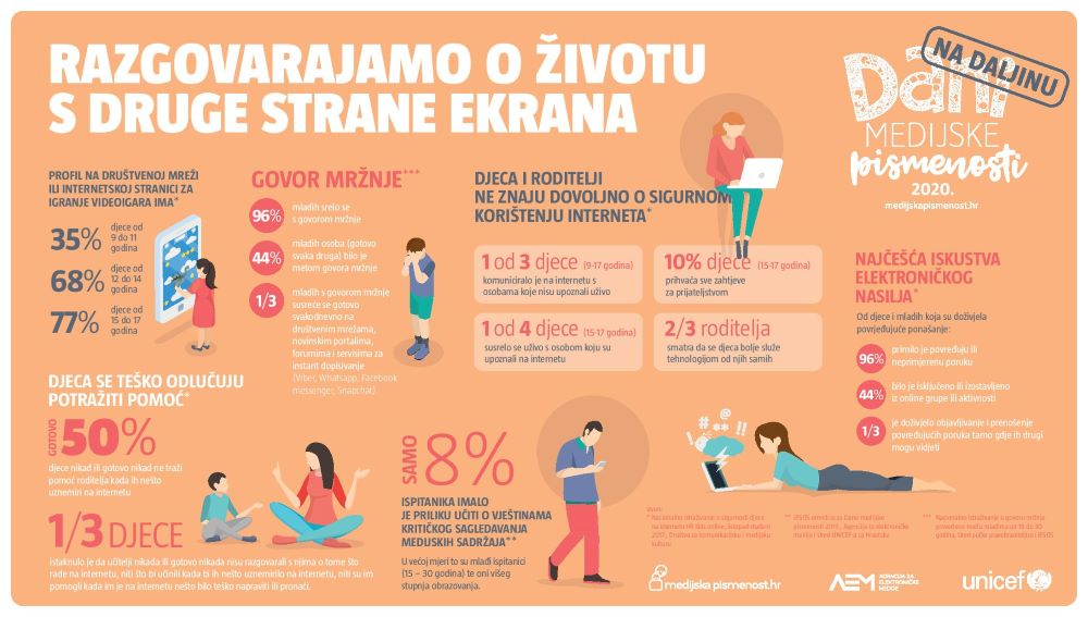 3. Dani medijske pismenosti, koji su se trebali održati od 30. ožujka do 5. travnja, u organizaciji Agencije za elektroničke medije i Ureda UNICEF-a za Hrvatsku, u suradnji s brojnim partnerima i pod pokroviteljstvom Ministarstva kulture i Ministarstva znanosti i obrazovanja, sada se održavaju na daljinu, a dio aktivnosti uživo održat će se u predstojećim mjesecima.