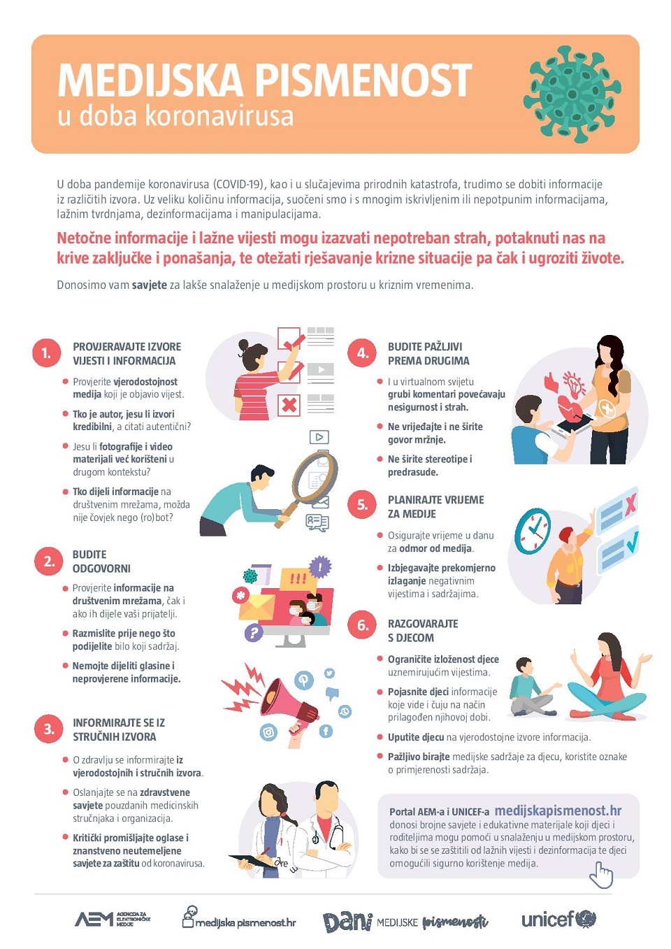 Vještine medijske pismenosti u ovim kriznim trenutcima osobito su važne, jer nam mogu pomoći da se zaštitimo od utjecaja brojnih neprovjerenih informacija i dezinformacija koje prate pandemiju koronavirusa, a koje postaju viralne na društvenim mrežama ili se proslijeđuju putem aplikacija za dopisivanje. Uz to, problem je i senzacionalistički pristup nekih medija u izvještavanju o širenju koronavirusa, što je također važno prepoznati i zadržati kritički odmak.