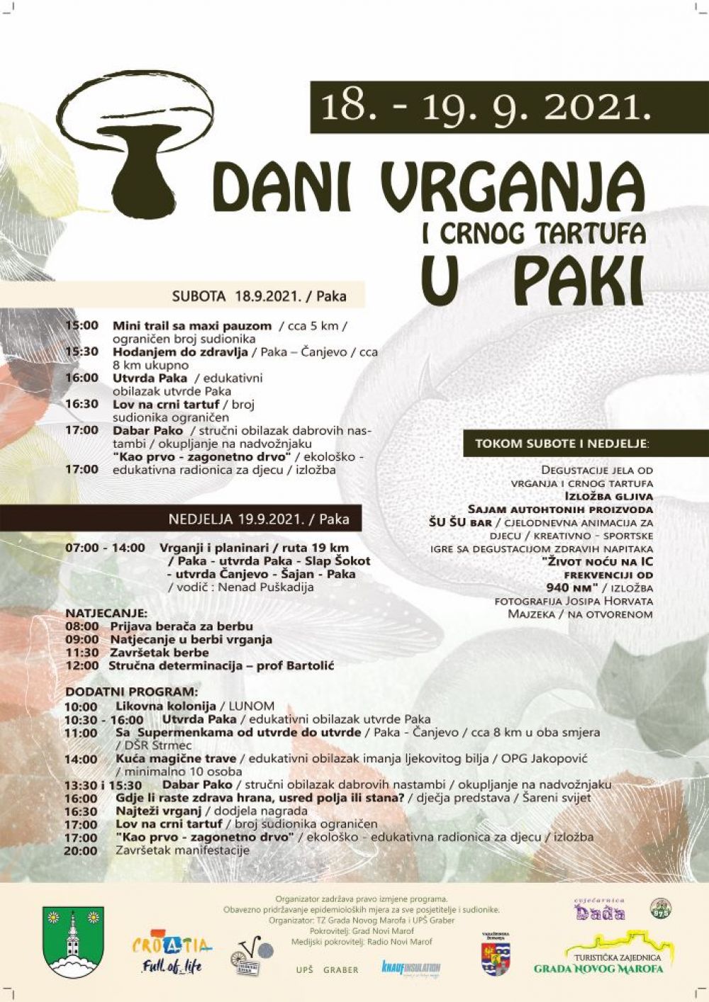 Već tradicionalno, trećeg vikenda u rujnu, a ove godine to je 18. i 19. rujna u Paki, kod Novog Marofa održat će manifestacija "Dani vrganja u Paki. druženje je to s prirodo i u prirodi, u šetnji pitomim šumskim puteljcima i uživanje u branju gljiva. Uz stručni skup, determinaciju gljiva, natjecanje u berbi, biti će tu ponovno mnogo popratnog programa u kojem će moći uživati svi posjetitelji, bilo da su vješti u branju gljiva ili su samo rekreativci.