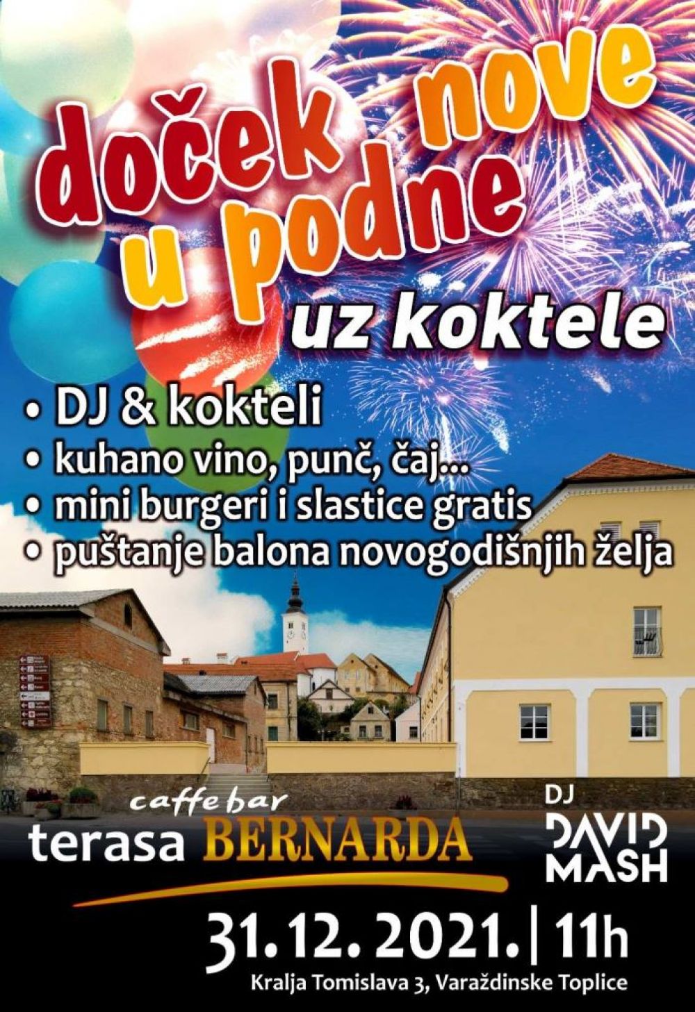 Najšarmantniji i najromantičniji doček Nove godine u podne u sjevernoj Hrvatskoj priprema, ove godine po prvi puta, Caffe bar Bernarda u Varaždinskim Toplicama. Tvrtka Bernarda Nova, u godini koja je pred nama, priprema ogroman iskorak u turizmu najstarijeg termalnog lječilišta u Hrvatskoj jer osim dosadašnjih kapaciteta - boutique hotela, Pizzerije te restorana s pet zvjezdica i tome prilagođenoj ponudi, u 2022. otvara i novi hotel s velikim vlastitim bazenom s termalnom vodom.
