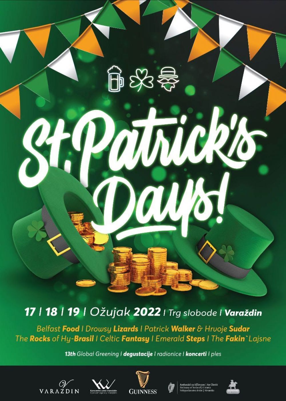 Koncertni ured Varaždin uz pokroviteljstvo Grada Varaždina te podršku Turističke zajednice grada Varaždin te Veleposlanstvom Irske u Republici Hrvatskoj, u Varaždin dovodi feštu Svetog Patrika! Dašak Irske osjetit će se od 17. do 19. ožujka na Trgu slobode koji će za tu priliku biti zatvoren za promet i transformiran u zelenu oazu.