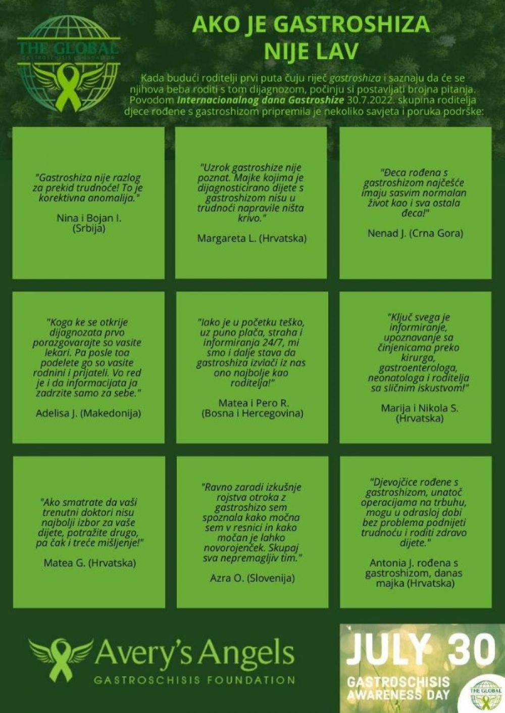 Za emocionalnu i informativnu podršku, budući (i sadašnji) roditelji djeteta s gastroshizom, mogu se javiti lokalnim volonterima u The Global Gastroschisis Foundation:
