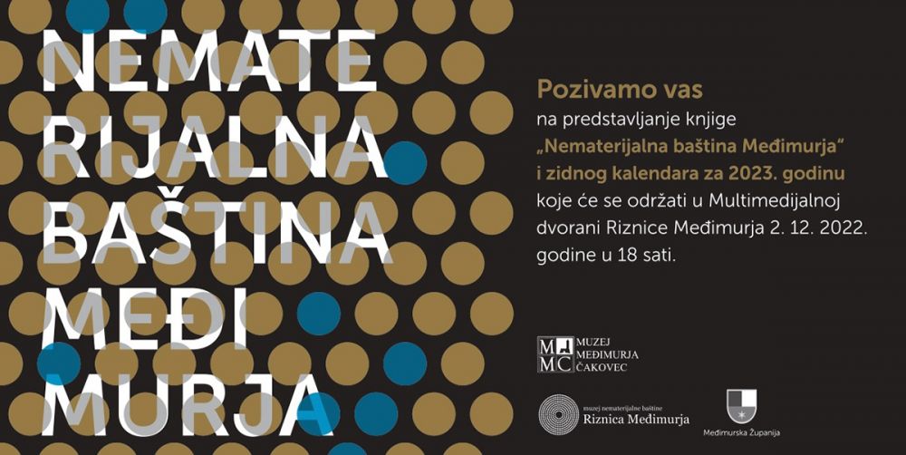 Promocija knjige i kalendara „Nematerijalna baština Međimurja“ održat će se u petak 2. prosinca u Multimedijalnoj dvorani Riznice Međimurje s početkom u 18 sati. Knjiga izlazi u izdanju Muzeja Međimurja Čakovec i donosi rezultate rada na istraživanju nematerijalne baštine Međimurja koji su se odvijali zadnjih pet godina. U knjizi su obrađena dobra koja su zaštićena kao nematerijalna dobra ili u završenoj fazi postupka zaštite: