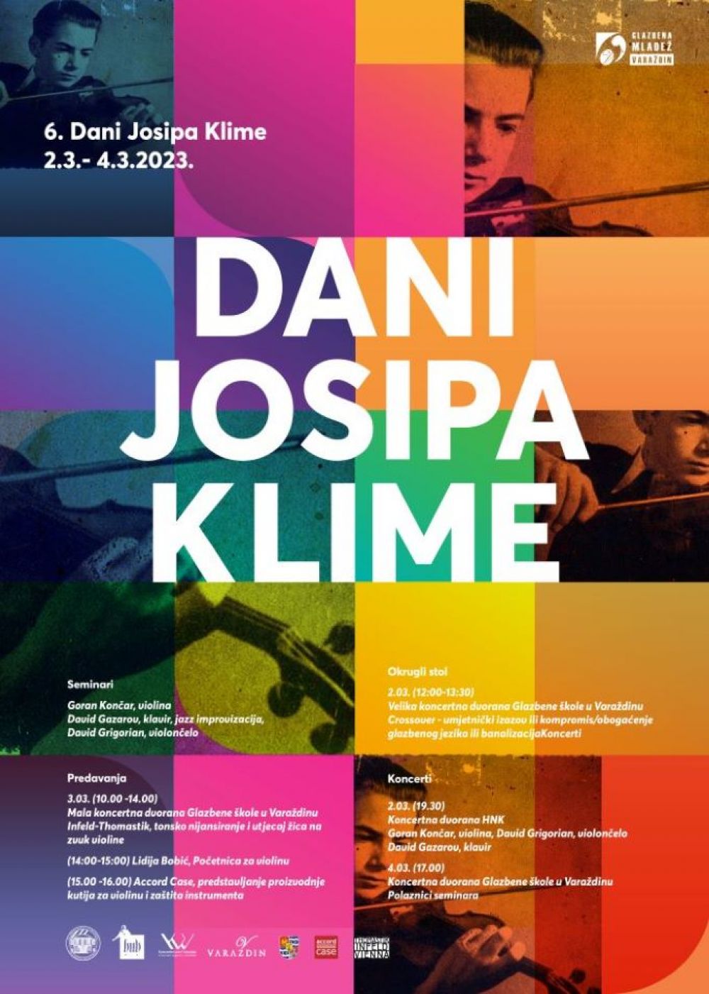 U Glazbenoj školi u Varaždinu,od 2. do 4. ožujka, održat će se šesti put za redom Dani Josipa Klime. Rođeni Varaždinac, Klima je jedan od najvećih hrvatskih violinista 20. stoljeća. Raspon njegovog djelovanja iznimno je širok – bio je vrhunski solist, komorni i orkestralni glazbenik, producent i pedagog. Glazbenik je to koji je praizveo, za kojeg je napisano ili u suradnji s kojim je nastalo preko tridesetak djela suvremenog hrvatskog glazbenog stvaralaštva i koji je zaslužan za vraćanje ili stavljanje na redovan repertoar solističke violinističke i komorne glazbe niza remek-djela hrvatske glazbene baštine.Također jedan je od prvih crossover glazbenika, u vrijeme kada taj pojam još nije ni postojao.