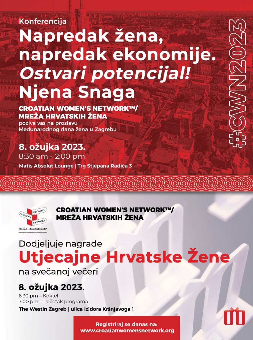 Žensko poduzetništvo, rodna ravnopravnost i društvena pravednost te ženska uloga u očuvanju hrvatskog identiteta u Hrvatskoj i inozemstvu bit će u fokusu šeste međunarodne konferencije ''Napredak žena. Napredak ekonomije. Ostvari potencijal!'' pod geslom 'Njezina snaga', u Zagrebu, 8. ožujka, 2023. u organizaciji Croatian Women’s Network™/Mreže hrvatskih žena.