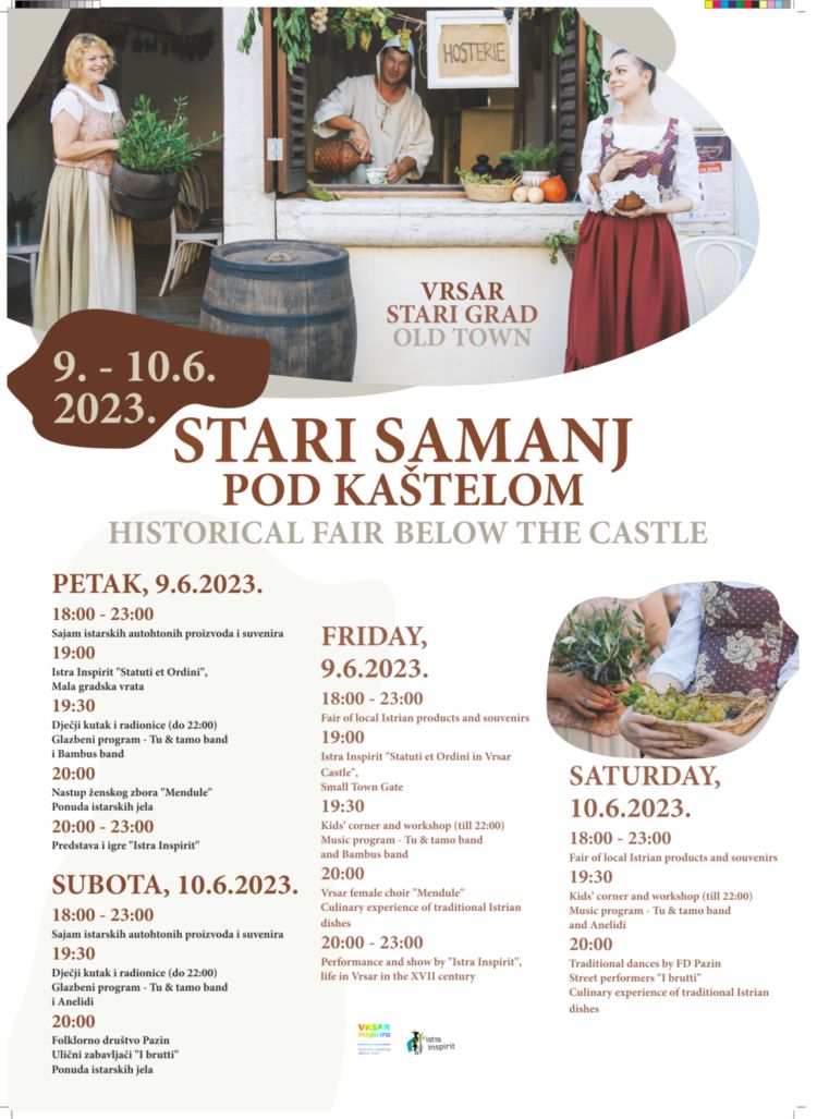 U petak 9. i subotu 11. lipnja na trgu ispred župne crkve i ulicama u starogradskoj jezgri Vrsara održat će se 12. po redu Stari samanj pod kaštelom. Za vrijeme trajanja sajma vrsarskim će starim gradom zavladati ugođaj života iz doba Vrsarske grofovije. Vrsarska grofovija ukinuta je 1778. godine, no kao najveće i najbogatije imanje tadašnjih porečkih biskupa, ovom je gradiću donijela brz razvitak i znatan prestiž, uvjetovan i povijesnim statutom iz 1609. Vrsarskim statutom bio je osiguran red u gradskoj jezgri, strogo se kontrolirao rad trgovaca, vinara, pekara, mesara, ali i ponašanje posjetitelja. Ulazna su se gradska vrata zaključavala navečer, već je onda bilo zabranjeno bacanje smeća, nadzirale su se oštarije, a higijena i čistoća vode bile su na visokoj razini.