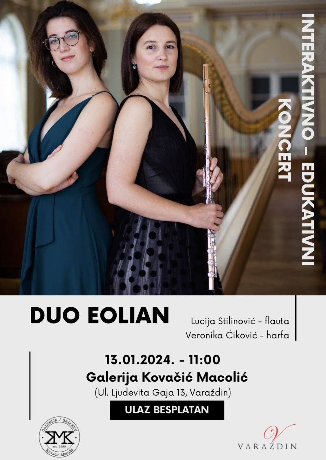 U subotu, 13. siječnja u 11 sati u izložbenom salonu Galerije Kovačić Macolić održat će se interaktivno-edukativni koncert Dua Eolian. Cilj koncerta je kroz zajedničko druženje potaknuti publiku na suradnju i interakciju. Održati će ga Lucija Stilinović (flauta) u suradnji s kolegicama Veronikom Ćiković (harfa) - kao Duo Eolian i Klarom Macolić Kuparić koja je kurator izložbenog djela projekta.