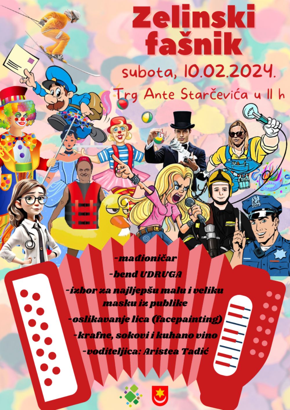 Turistička zajednica grada Svetog Ivana Zeline poziva Vas da se maskirate i dođete na veseli „Zelinski fašnik 2024.“ Zelinski fašnik 10. veljače na prostoru Trga Ante Starčevića počinje u 11 sati.