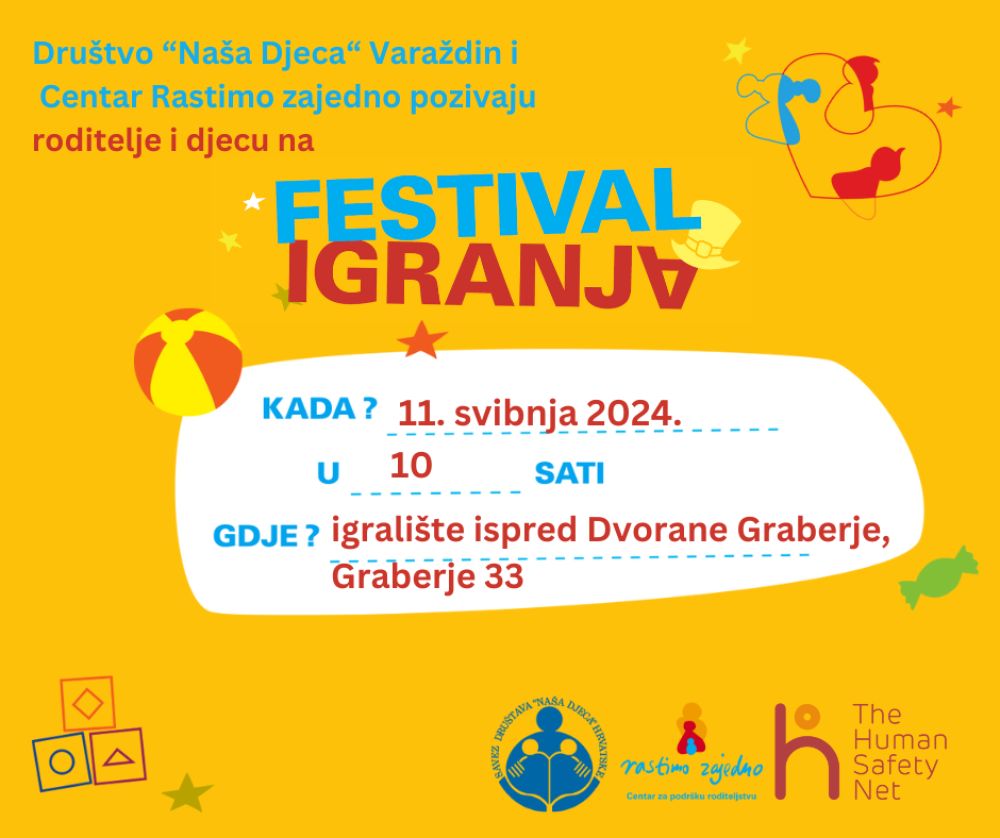 Saveza Društava „Naša Djeca“ i DND Varaždinu suradnji s Centrom Rastimo zajedno, a uz potporu inicijative The Human Safety Net organizira Festival igranja na igralištu kod Dvorane Graberje, u subotu, 11. svibnja u 10 sati, uoči Međunarodnog dana obitelji. U slučaju lošeg vremena, Festival igranja održat će se u Dvorani Graberje.