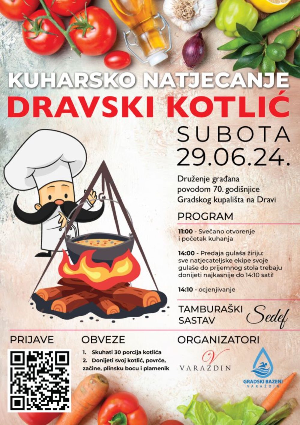 Uključite se u natjecanje Dravski kotlić - natjecanje u kuhanju gulaša u kotliću, koje će se održati u povodu 70. godišnjice Gradskog kupališta na Dravi.Datum i vrijeme: 29. lipnja s početkom u 11.00 sati – predviđeno trajanje do 17 sati. Mjesto: Gradsko kupalište na Dravi.Organizator: Javna ustanova Gradski bazeni Varaždin. Pokrovitelj: Grad Varaždin, Rok prijave: do 24. lipnja.