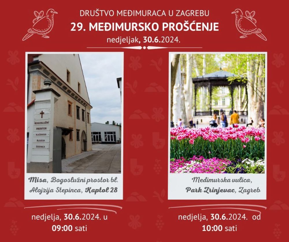 Društvo Međimuraca u Zagrebu najavljuje ovogodišnju tradicionalnu vjersko-kulturnu manifestaciju Međimursko prošćenje, koja će se održati 30. lipnja na Zrinjevcu. Ova manifestacija pruža jedinstvenu priliku za doživljaj bogate međimurske kulture i tradicije u srcu Zagreba. Posjetitelji će moći uživati u autentičnim proizvodima, glazbi i običajima iz Međimurja. Program događanja započinje svetom misom u 9 sati, u bogoslužnom prostoru Blaženog Alojzija Stepinca na Kaptolu 28. Nakon toga, od 10 do 13 sati, posjetitelji će se moći pridružiti svjetovnom dijelu prošćenja u Parku Zrinjevac.